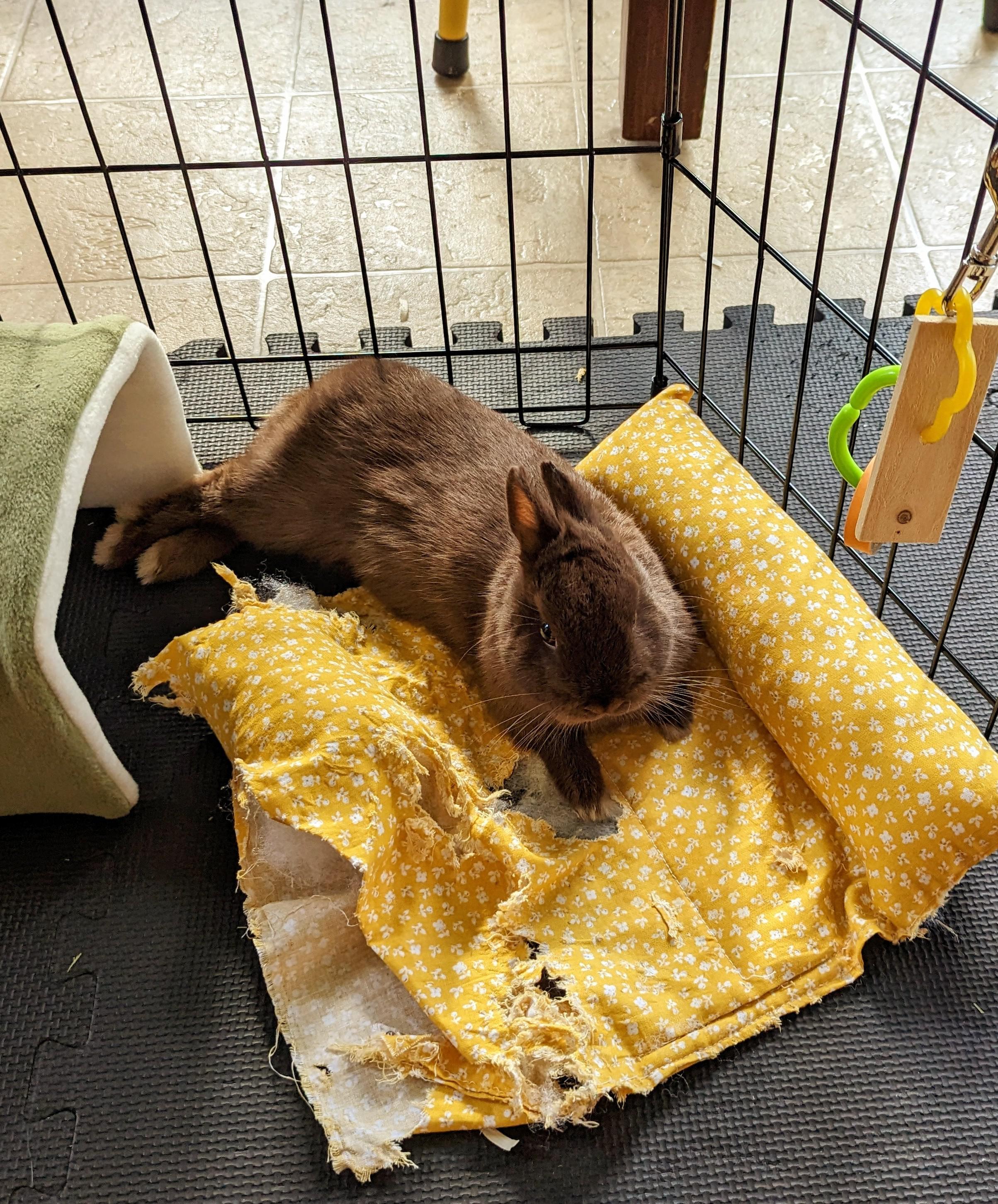 Its402am 3 years ago I’m terrified to buy a $50CAD bed for my buns for this exact reason. I wish they were more selectively destructive haha.Super cute noodle tho! I love that warm brown colour of their fur. And they look super proud of the big mess.