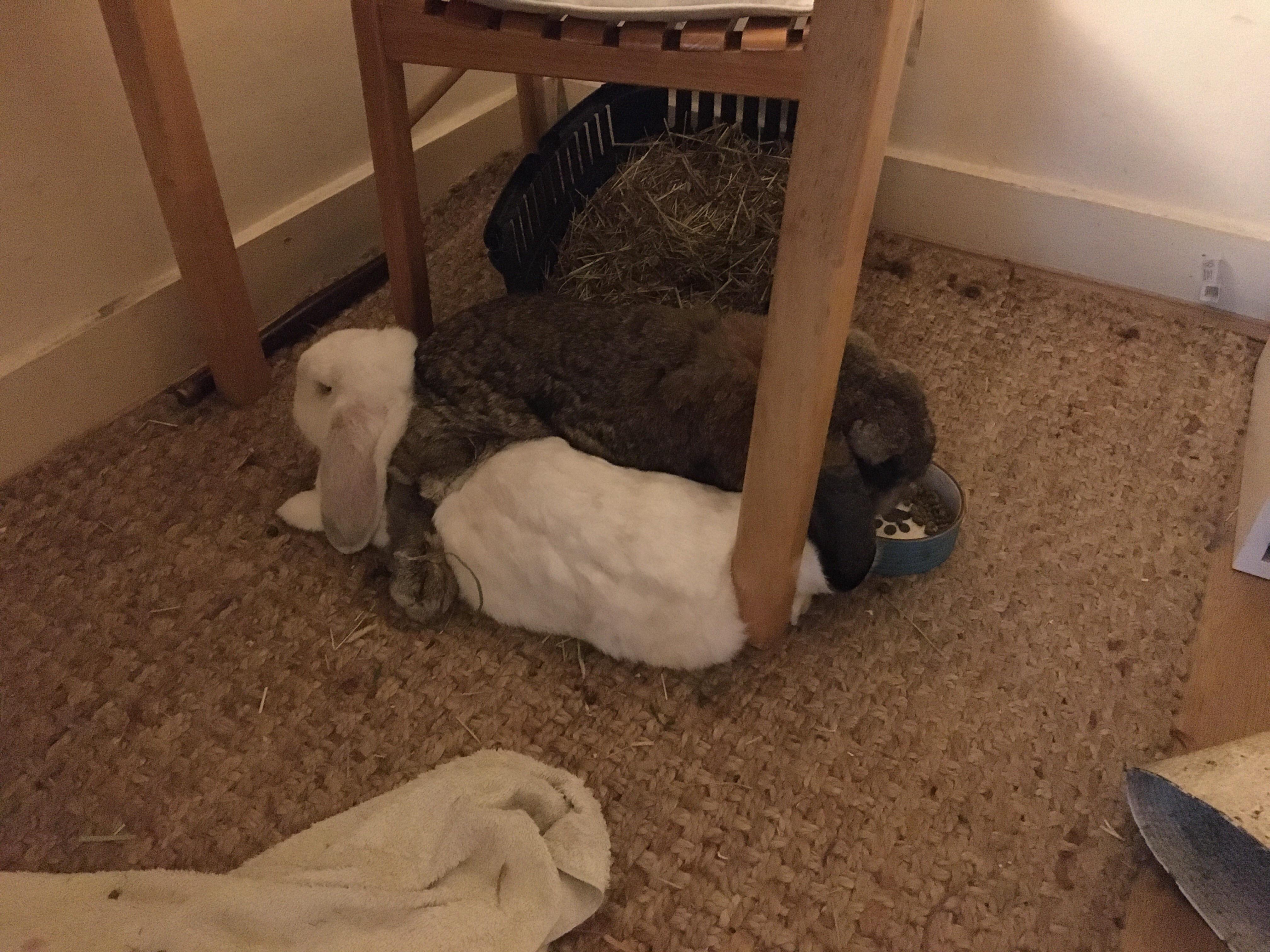 So I moved my outdoor rabbits inside to avoid the main heat of the midday sun as it’s uncomfortably hot for London (even non furry humans are struggling) but apparently this is prime time to gain access to the food bowl by climbing on top of her partner and casually staying like that while polishing off the last of the nuggets 😂.