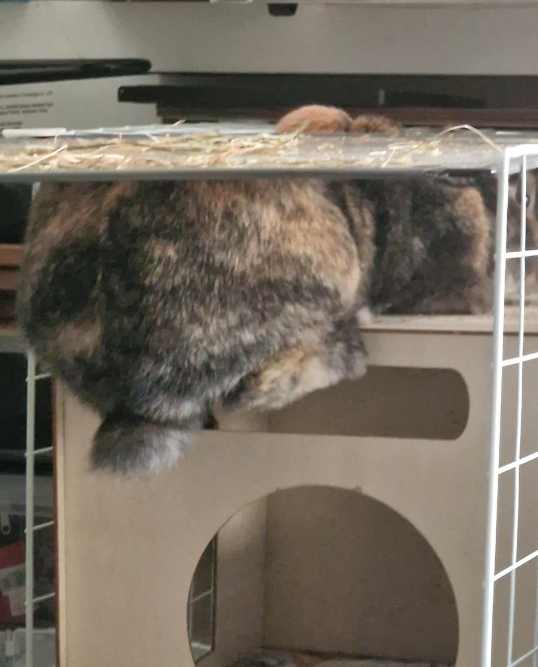Bunnies do sometimes go in the weirdest places. But from your pictures I can tell your bunny needs more space and somewhere confortable to lie on. The floor of the cage might hurt his paws.