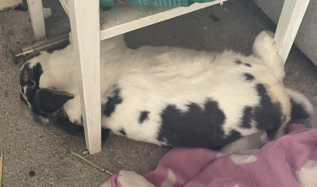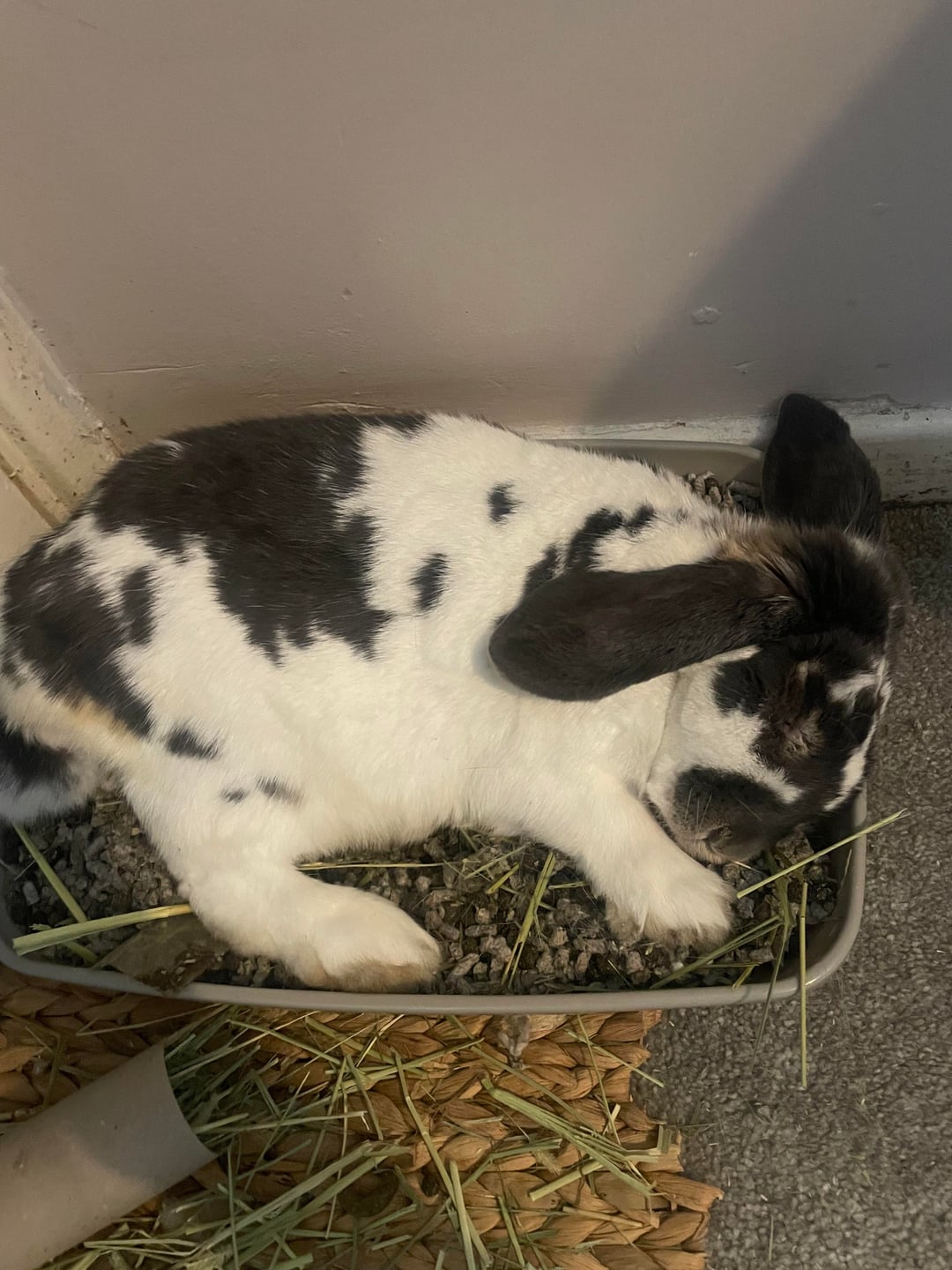 He’s a mini lop , he likes to flippity flop in his toilet (only after banking all the bedding up to the sides and sometimes over the sides) OR under the bedside table where he makes sure his back hoofs and pressed really tight against the legs of the table.