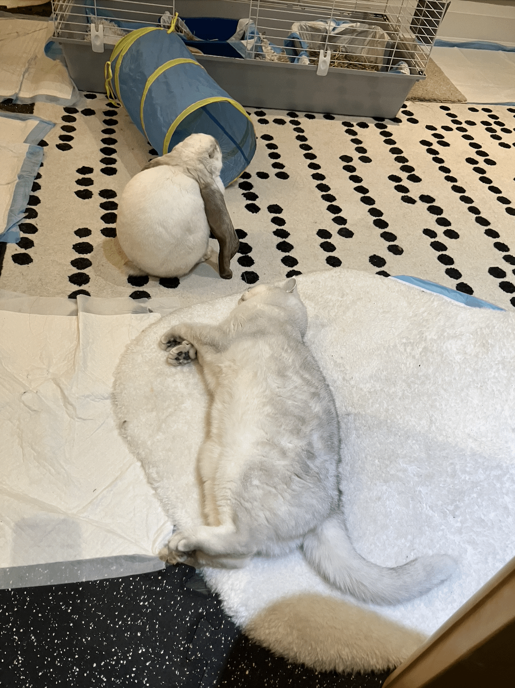 Long story short, I help rehome a rabbit that's not mine. The rabbit is an English Lop, boy, 1 year old, neutered, 3.4kg. Previous owner is my former friend. I took over the rabbit temporarily when previous owner can't care for him anymore. The new owner had him for a bit over 2 weeks. Yesterday I follow up with her to ask about rabbit, the new owner says he pees outside of litter box, not little pee stain like territorial marking, but a lot of pee, like empty his bladder type of peeing. To correct his behavior, she put him in the cage afterwards (not sure how long), and she place him in cage when she's out. I expressed my concerns about keeping him in a cage, and offer to come over and set up playpen to section her living room, where the rabbit is staying. But she declined because the rabbit is strong enough to escape playpen by lifting or pushing it. I propose to secure the playpen against furniture, but she declined, saying her living room is not big enough.