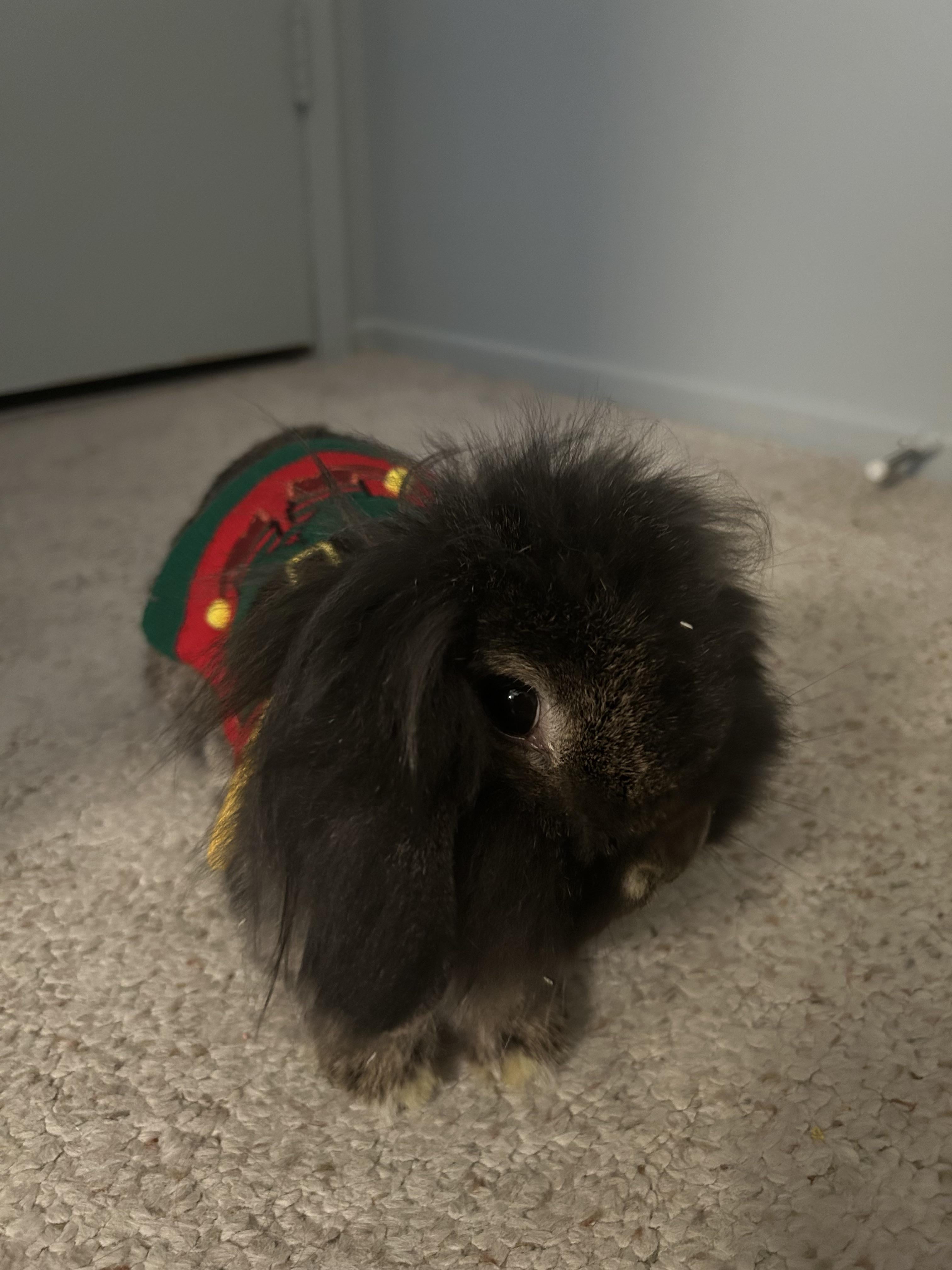 The Christmas sweaters for bunnies / small animals went on sale at my local Petco today so I grabbed a sweater for my bun 🙂 He looks quite dapper I think.