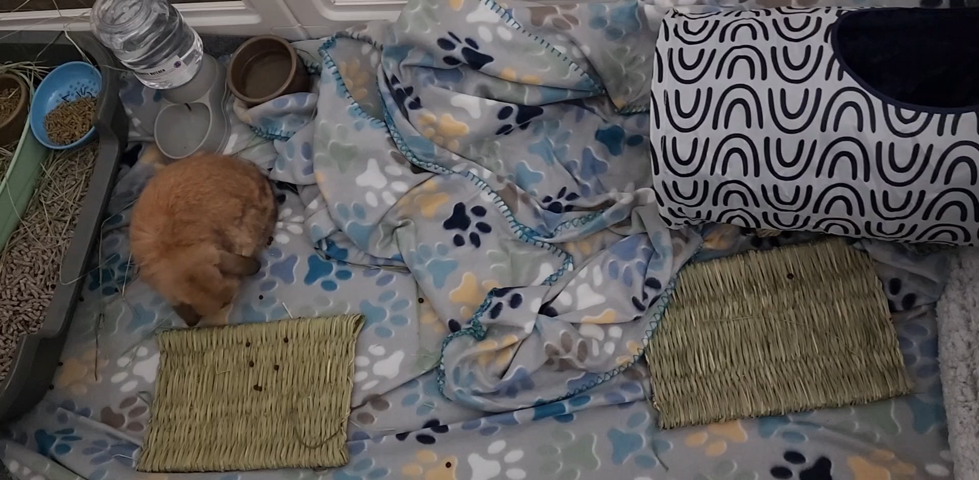 After I brought him home (the ride was less than 15 minutes), I noticed that he keeps itching his ears with his legs every ~10 minutes (I texted the breeder immediately), and he's unable to sleep for more than a few minutes because of it. So he keeps running throughout his play pen – from his litter box, to his tunnel which opens into his den, and back. He does take breaks, though. I did turn off the lights but he kept playing & I turned them back on because I was afraid he may injure himself if he can't see where he wants to jump. Also, I gave him 6 fleece blankets to cushion his jumps. He has a plush mat in his den but he's mostly been resting in his litter box.