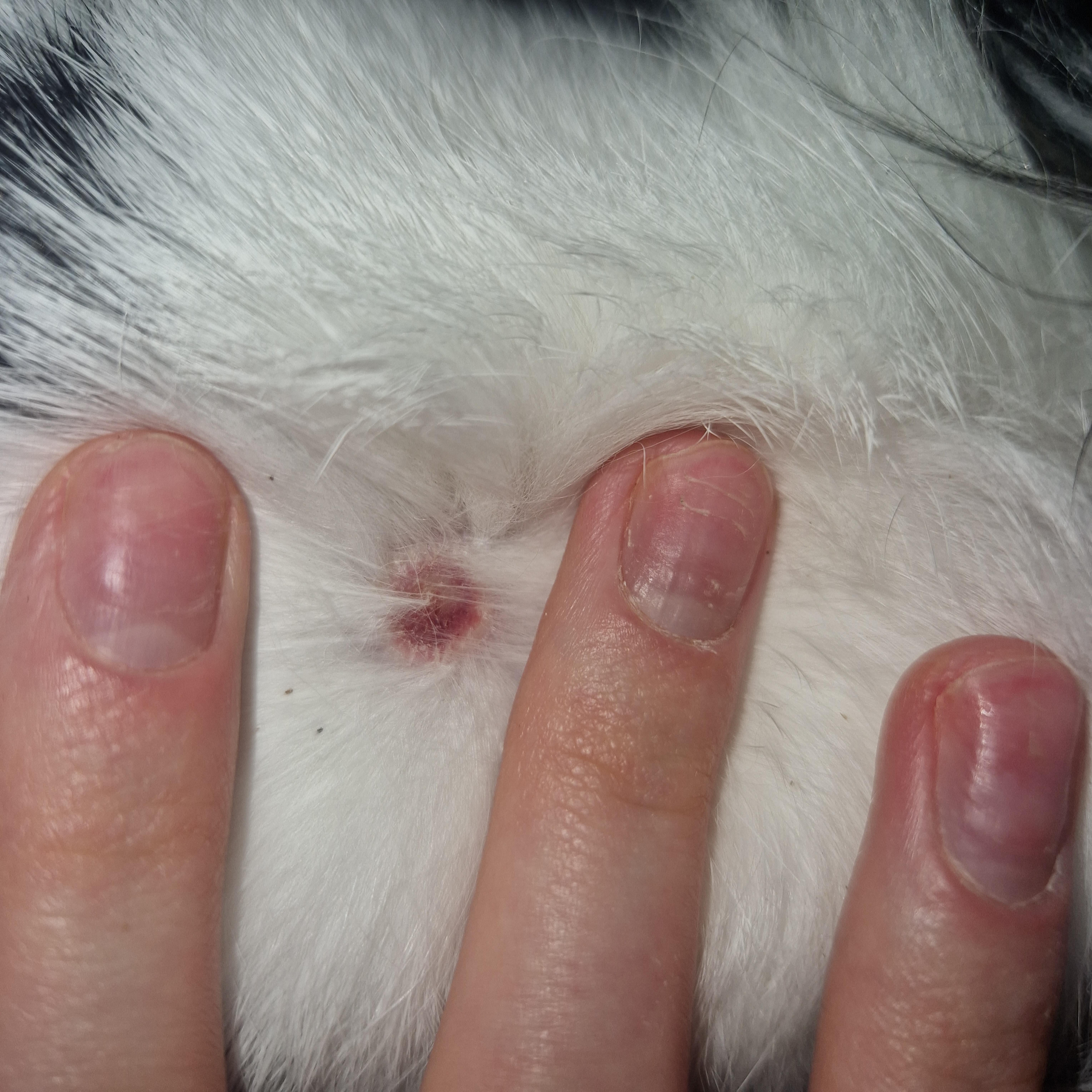 My bunny is about 2 weeks after her spay. I've just realised that she has that little scab like spot on her back. What that may be? Should I take her to the vet? She overall feels just fine, plays with me eats and does all her normal bunny things. She had been on an antibiotic for a week after her spay.