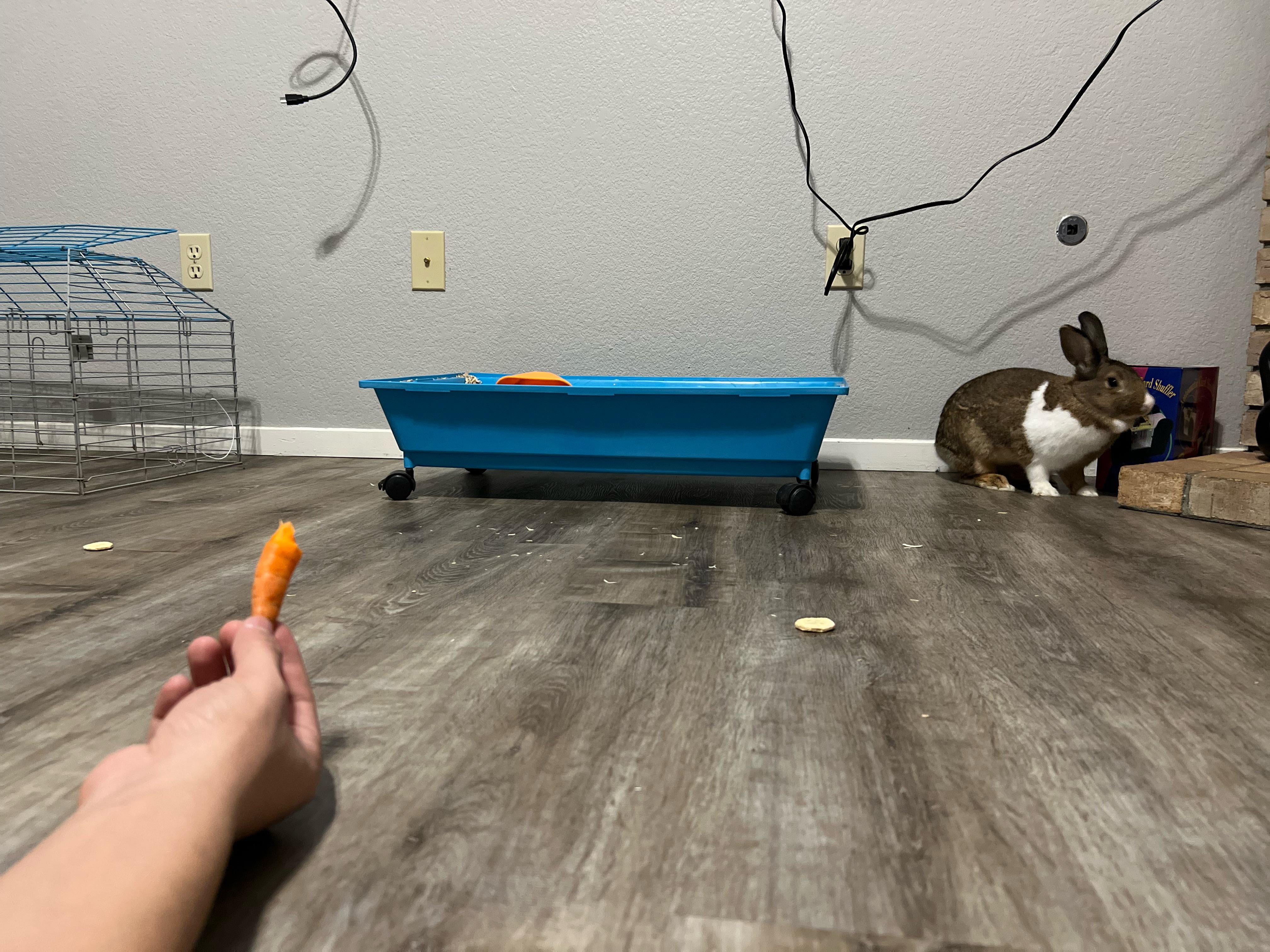 Put some natural dried bananas and some carrots down to start the bonding process.. just laying here not bothering her and also not forcing anything. Also bought some Timothy Hay and a ceramic bowl 👍🏼 just letting her run around and explore right now.. vets pretty booked trying to find a time that works with my schedule to take her. Was watching cinnabun for general info on YouTube and gonna check out the website she recommended for some chew toys.. decided to keep her two story hutch and I’m gonna buy the play pen as well. She definitely seems a little more comfortable but still very nervous. Will keep everyone updated on my little Lola ❤️
