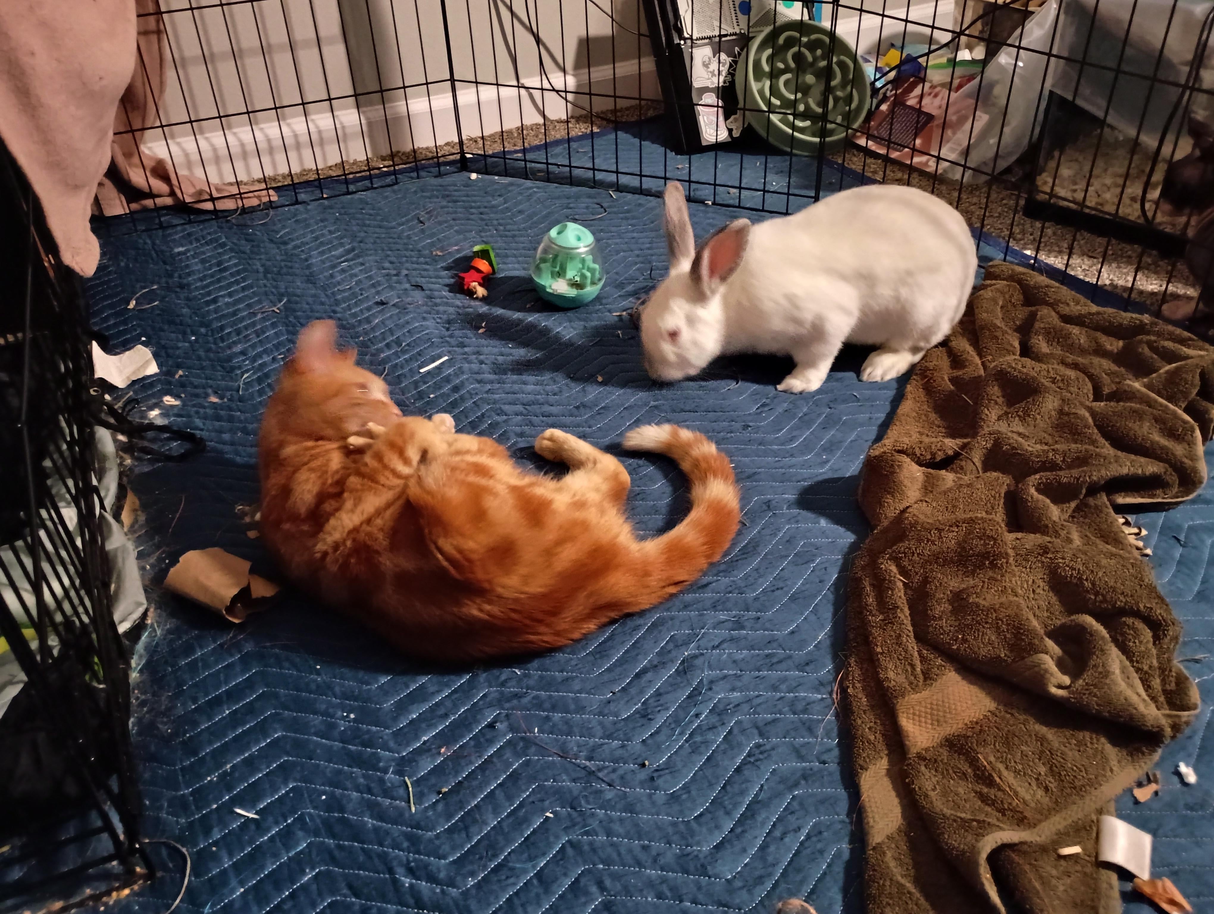 Casper was far more interested in finding snacks than giving Mars attention. Casper tolerates Mars presence in his pen, even letting Mars poke him, his favorite pass time. I don't leave them unsupervised like this since Mars is still young and learning. I've even seen Casper ask Mars to groom him a couple of times, though the poor cat doesn't quite understand what that means yet.