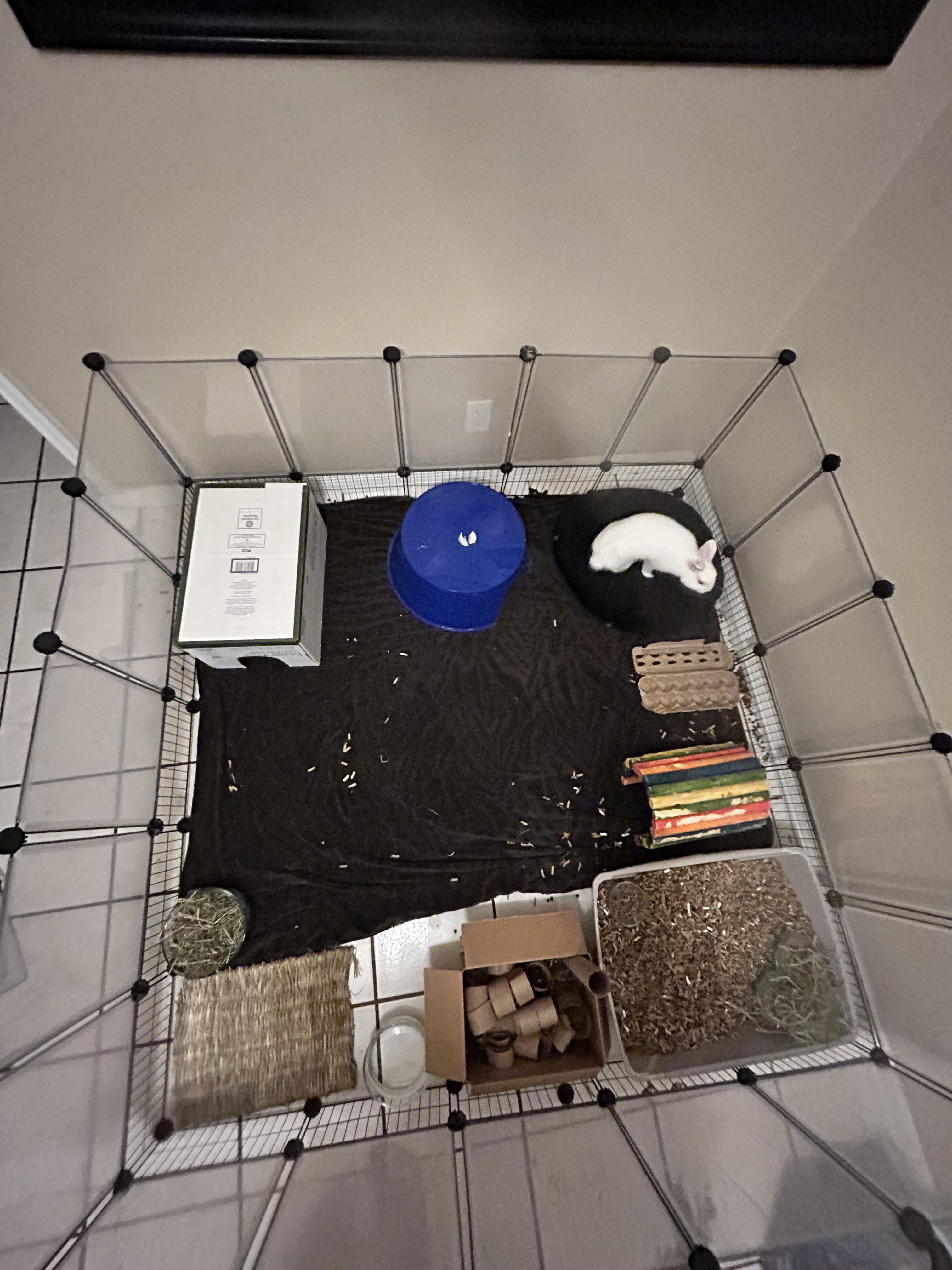 For context: I have had her for a bit. She has been getting about 2-4 hours of free roam in my room every night. I also give her a bucket of soil to dig through and make a mess out of every once in a while. She loves it but it’s way too messy to be a regular thing! She is pretty territorial, they tried to find a pair to bond with and after a couple months they gave the other bun up because they kept fighting, and she seems pretty happy now.