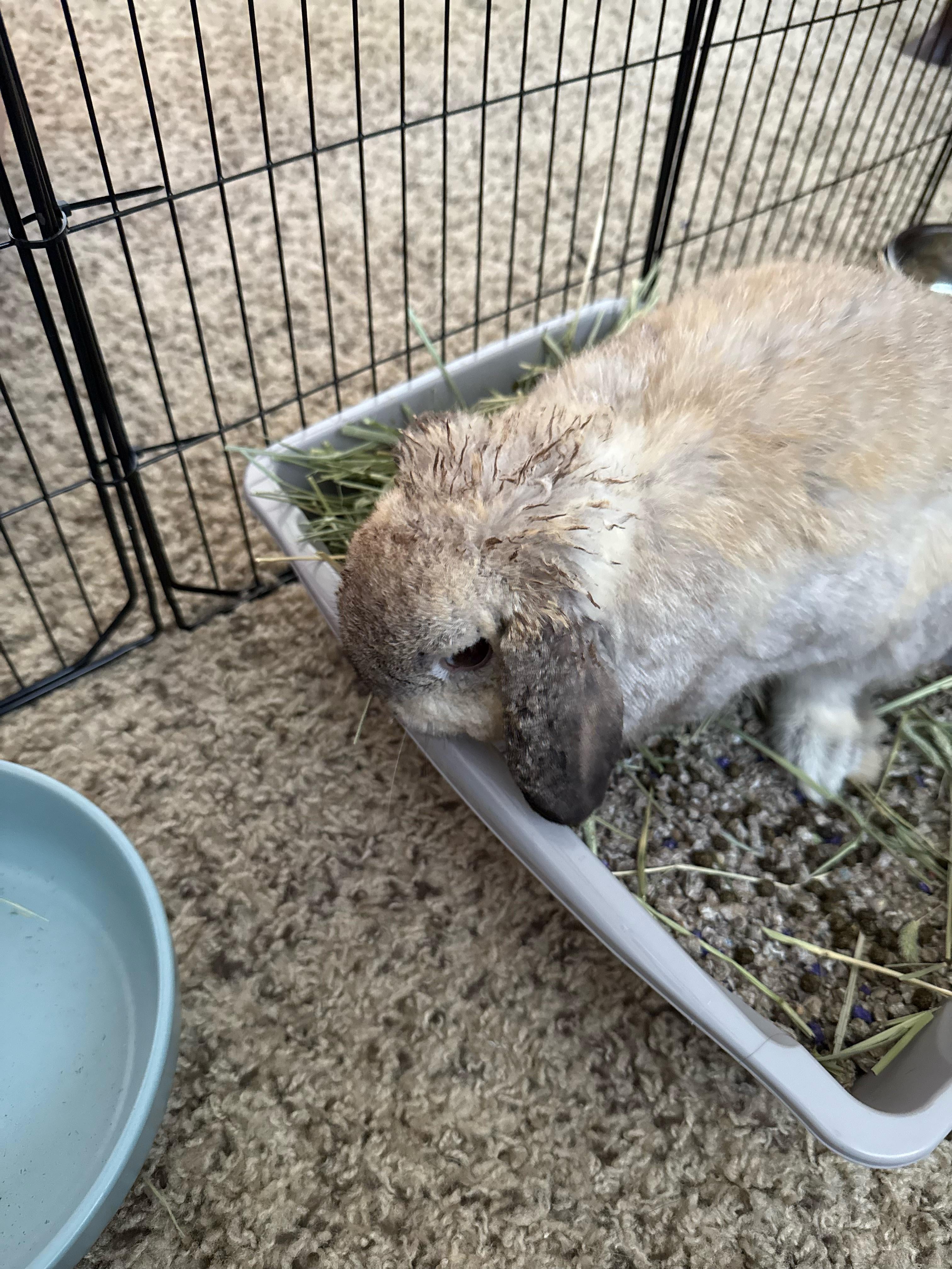 Hello, I was hoping you guys could help me out. My girlfriend got me a bunny for Christmas, he came from a woman who had a bigger bunny that was bullying him a bit so she couldn’t keep him. The fur on his head is pretty matted, what would the best way to go about fixing it? I read you could use a warm damp towel and a brush but I feel like it’s a little too matted, if so should I carefully trim the bad spots? His name is Ron Swanson by the way lol