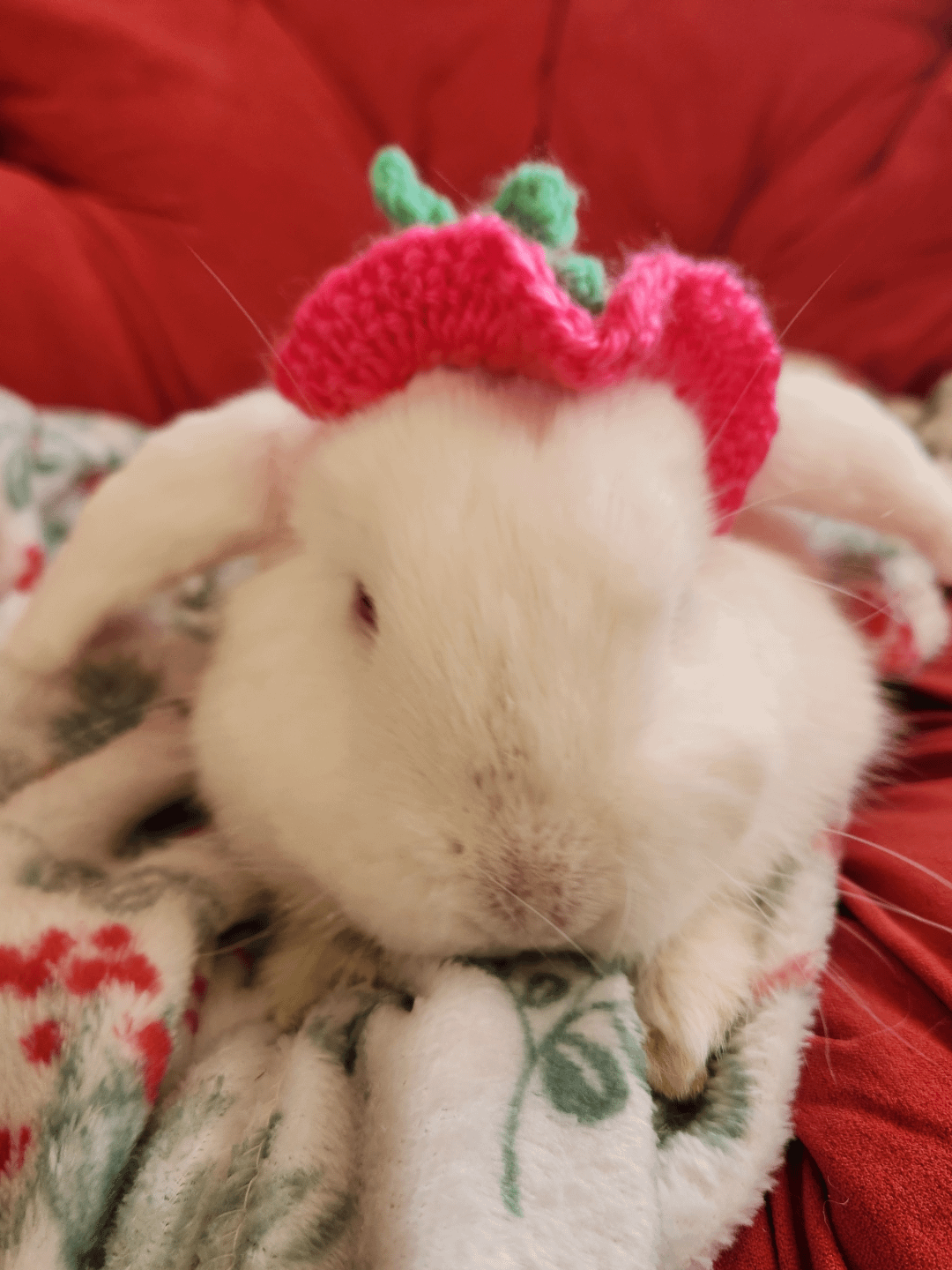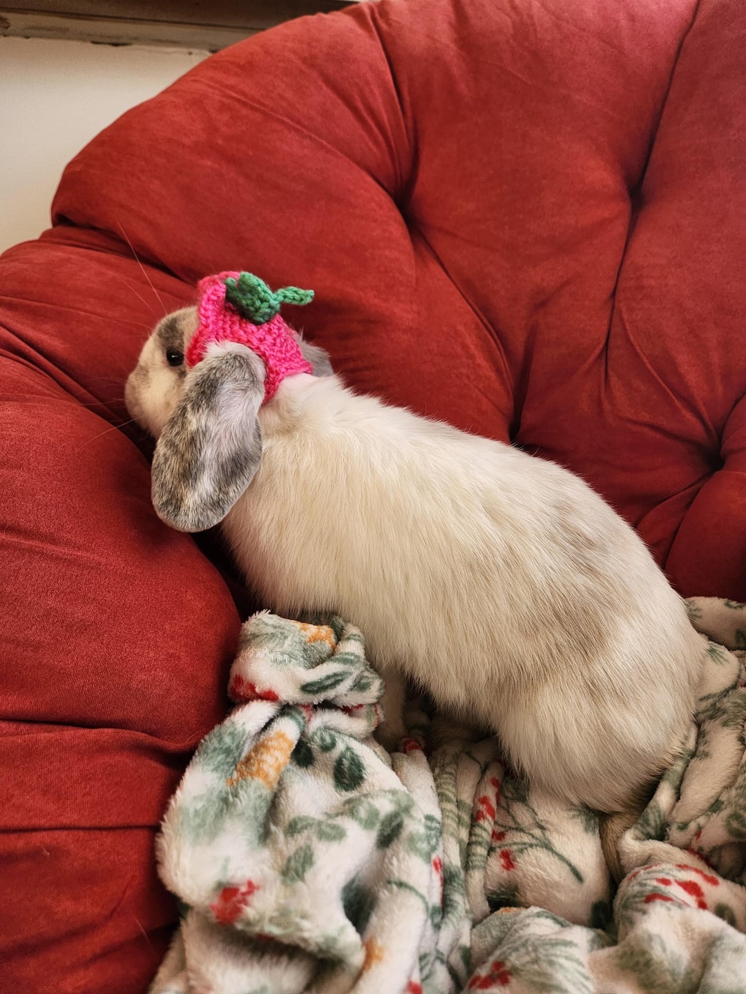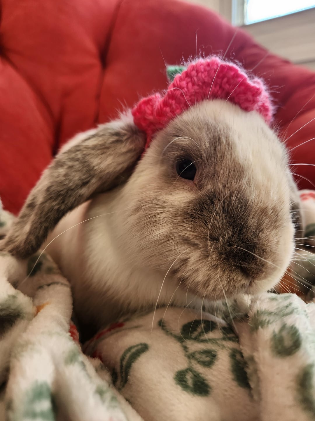 My students made a bunny hat – I put it on my bunnies. It's a bit too small for the growing flemish giant, but my lops wore it quite well! I've never put anything on their heads before, so they're all very concerned/confused looking.