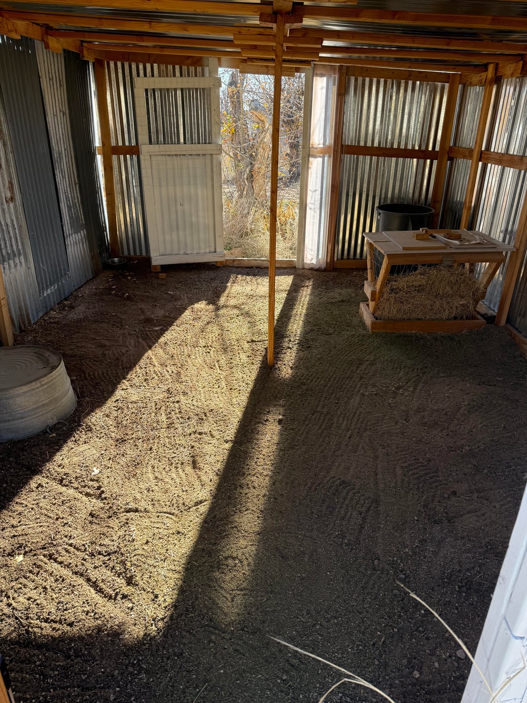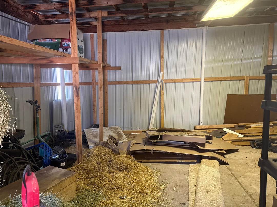 Option 2 – in the barn itself. Shaded, no wire openings for ventilation but not climate controlled either so may require a fan at times. Enclosed, can build pens or hutches again.
