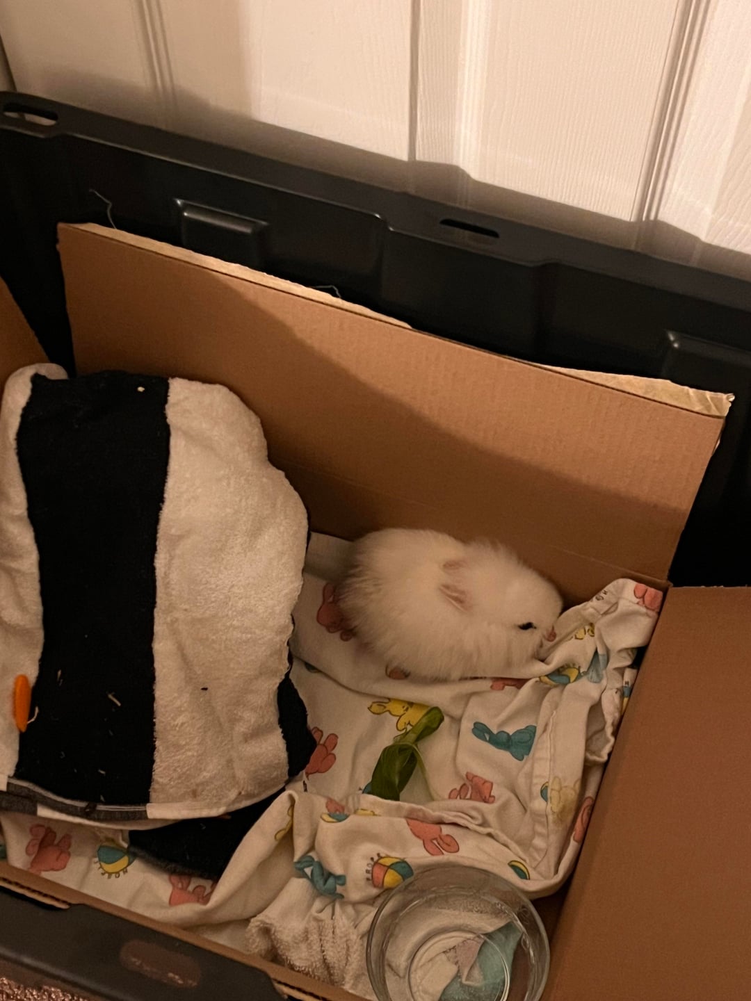 A friend rescued this bunny from his land , there was originally 2 but unfortunately the other bunny has not been seen for awhile and it started to heavily pour rain and hawks were after it 🙁 , so we decided it was best to rescue since it looks like a domesticated rabbit. It only looks like a couple weeks old. This habit is only temporary until i can provide a bigger space. I picked up some OXBOW timothy hay for now, the ingredients said it was high in fiber, and i put down a few tiny peices of bok choy and a water bowl. Any advice would really help since i am nervous and want to provide the best for it!