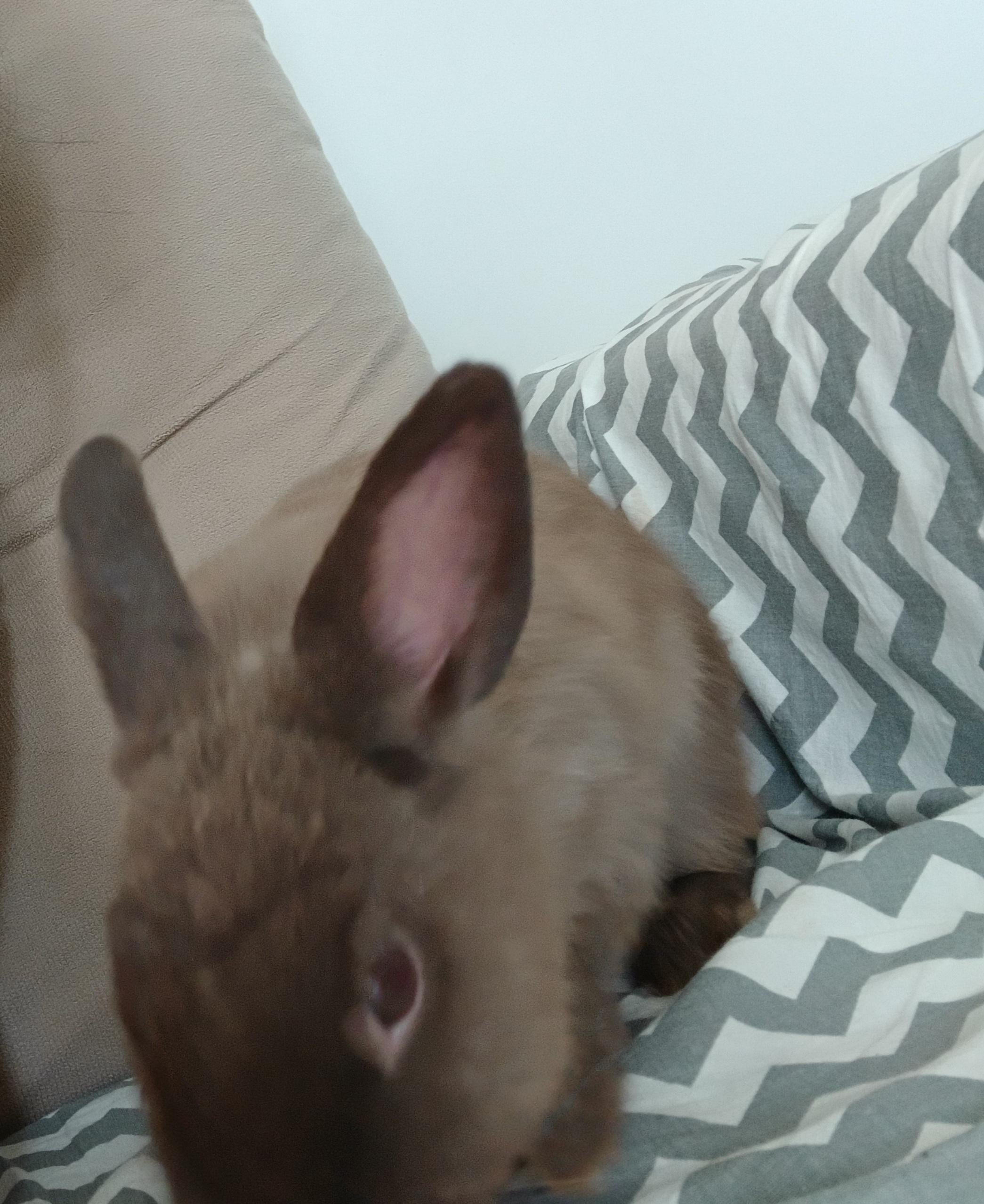 This is Rafini, she's 4 months and 22 days old. She's always been one to scratch clothes for attention and jump on laps, very energetic, but after an accidental contact (in the previous post) due to the other owner's carelessness, she became aggressive, even with me and away from the other rabbit. I went to bring her food (because it was raining I didn't let her go outside) but she's in her room, and I forgot that I had touched the other rabbit. When I offered her the carrot while holding it, she growled and jumped (and since she's never had this behavior before, I got scared and moved quickly, and I think that unintentionally reinforced her behavior). I want advice to help her. She's not aggressive, but now she seems very tense even in a separate place.
