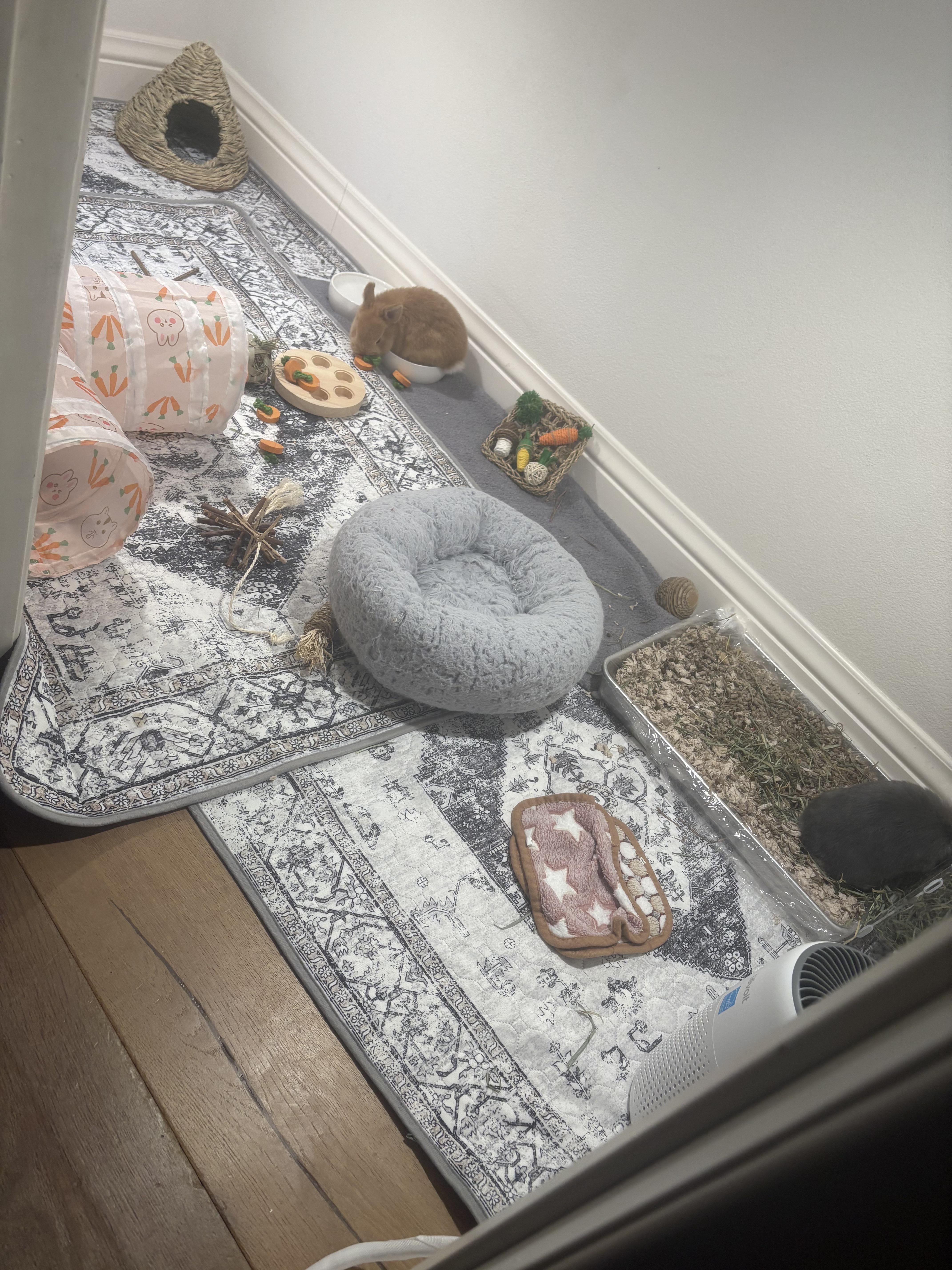We just turned our under the stairs kids toy room into a bunny room. The area used to be filled with kids toys but now that they are older we got rid of them and started a bunny room. My daughter just got two bunnies for Christmas. Plan to add some ramps and tunnels but they seem to be enjoying the space so far.