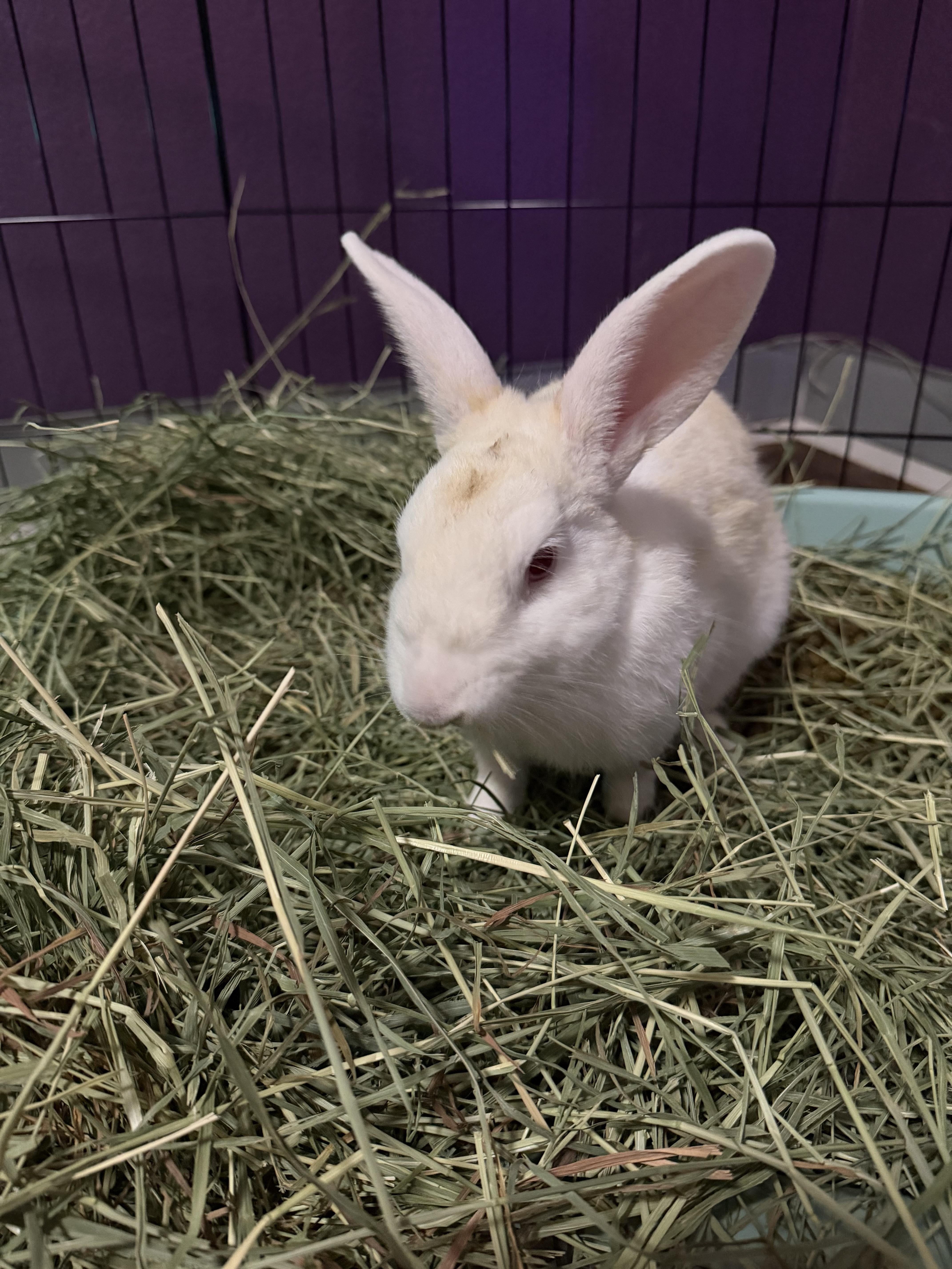 He was neglected so he has lots of yellow fur and a crusty forehead😔 I’m not sure if I should use pet wipes on him or not so I have let him be. He’s not scared of me anymore and he lets me pet him and does lots of binkies. His favorite time of the day is in the morning when he gets his pellets lol