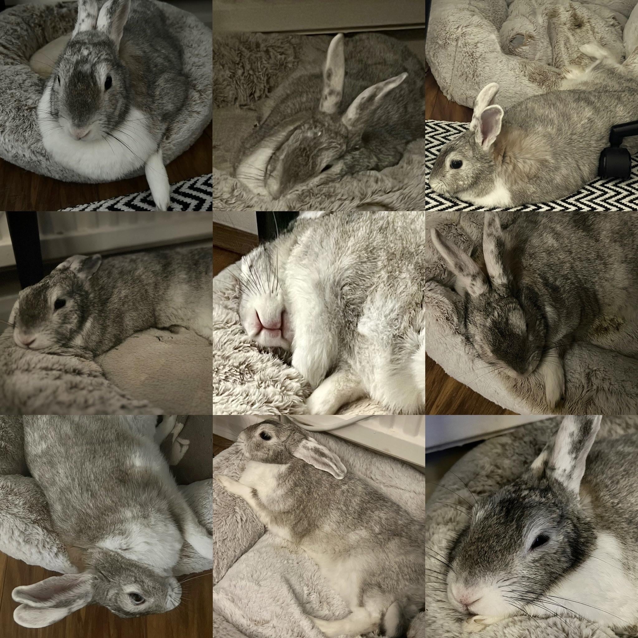 This rabbit adores his bed. My camera roll is stuffed full of photos of him lying in it at various weird angles. Sometimes his flops go wrong and he falls out. He styles it out though (see top right). My previous bunny only liked to rip the stuffing out of his bed and pee on it. This one will get out of bed for banana and very little else. Anyone else have 8000 photos of their bun in bed? No? Just me? 🤣