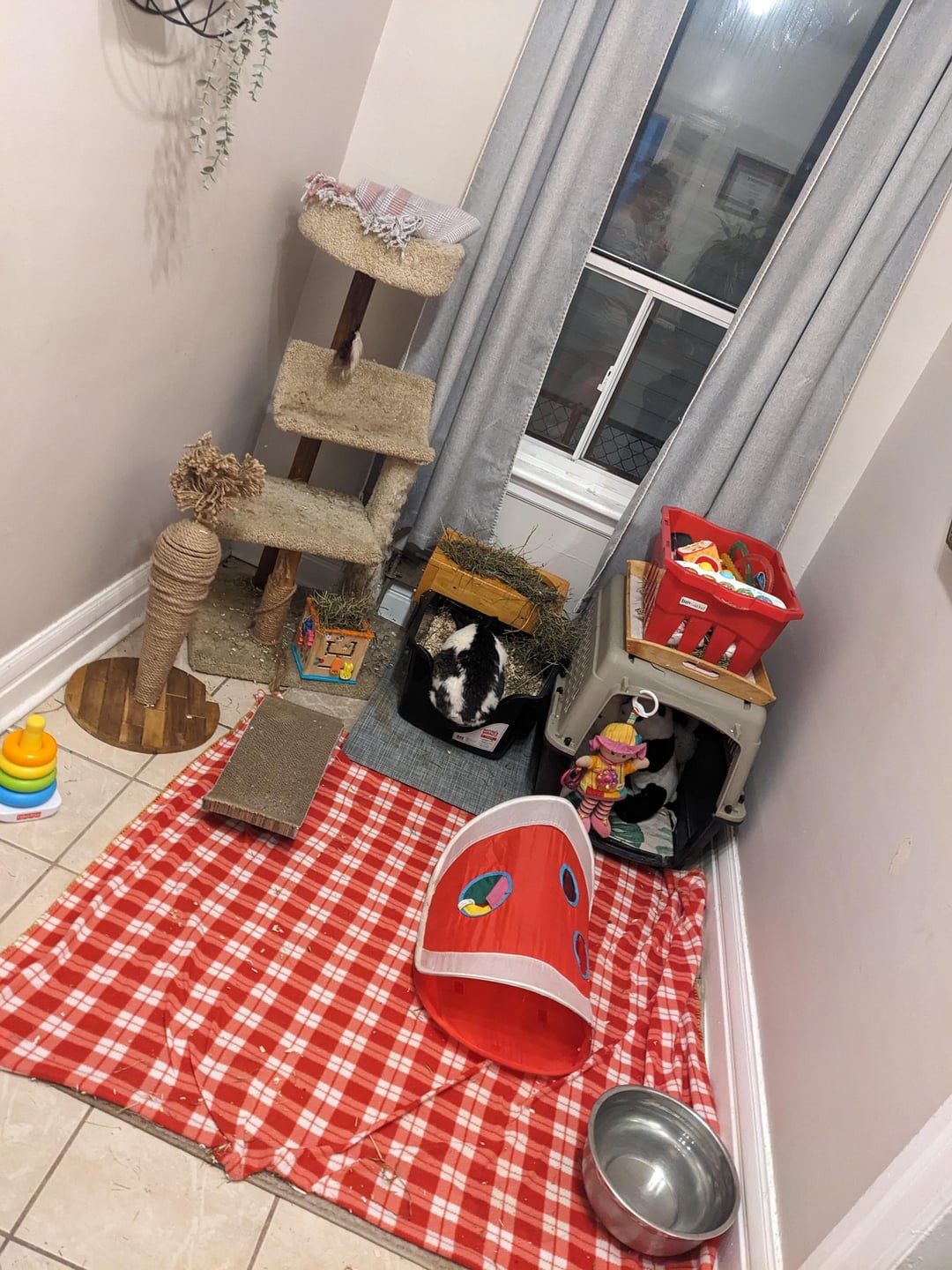 Also – how's the setup? I had a tall x pen around it but he would always hop out and lock himself out 😂 so I took the x pen out. But he still hardly uses his area and I can't understand why that is.