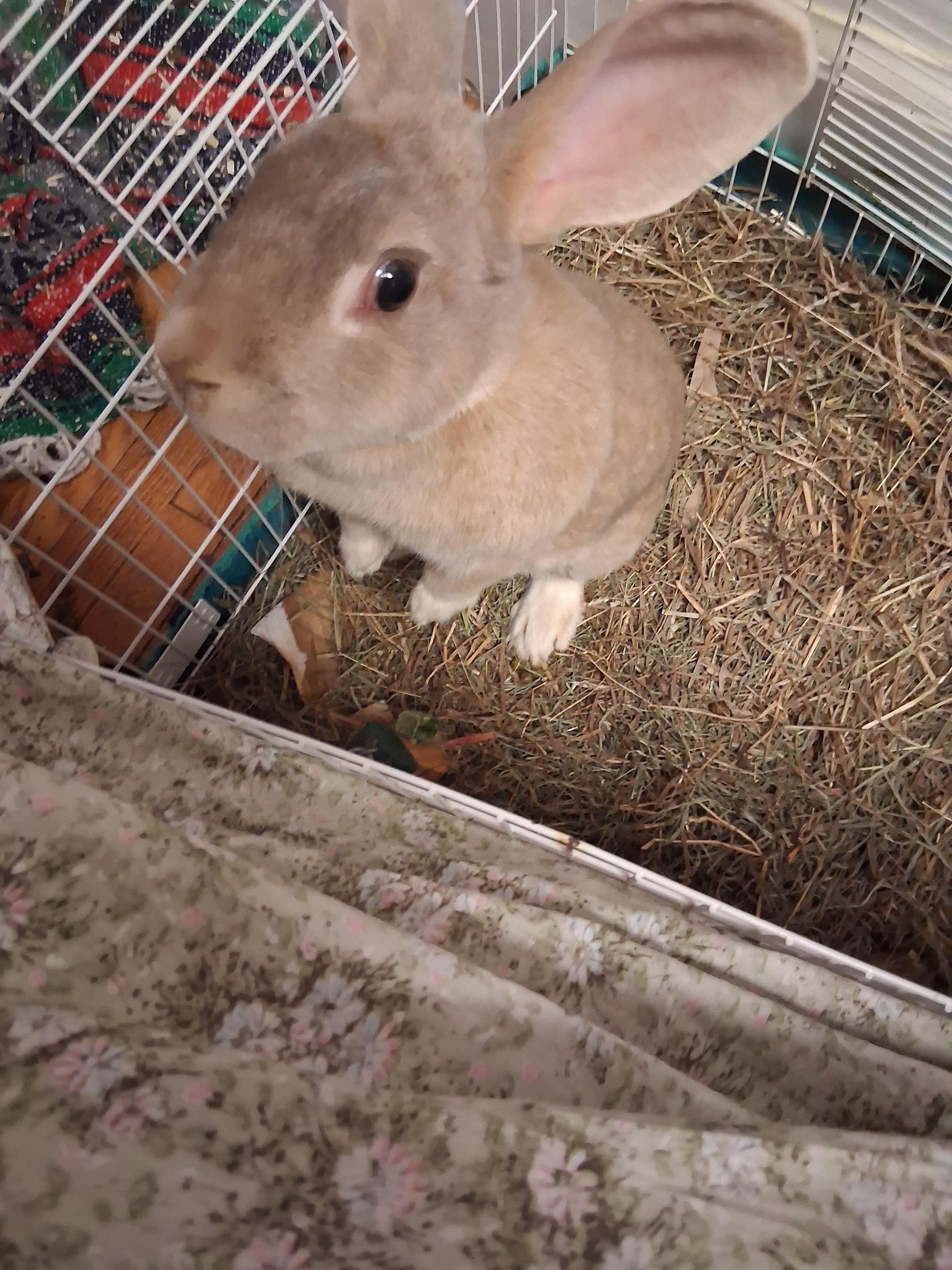 She is a 3-4 yr old, unspayed flemish giant, who i rescued from someone's backyard right before this crazy weather started. Her previous owner kept her in a hutch, never interacted with her, and didn't feed her regularly. At the moment, she has a space that is blocked off from my bed by a curtain about 3 ft tall. She really likes peeing on my bed, so I don't want her on there without supervision. I keep making the barrier more secure and taller and she keeps jumping over. It's reached the point where I can't really make it taller.