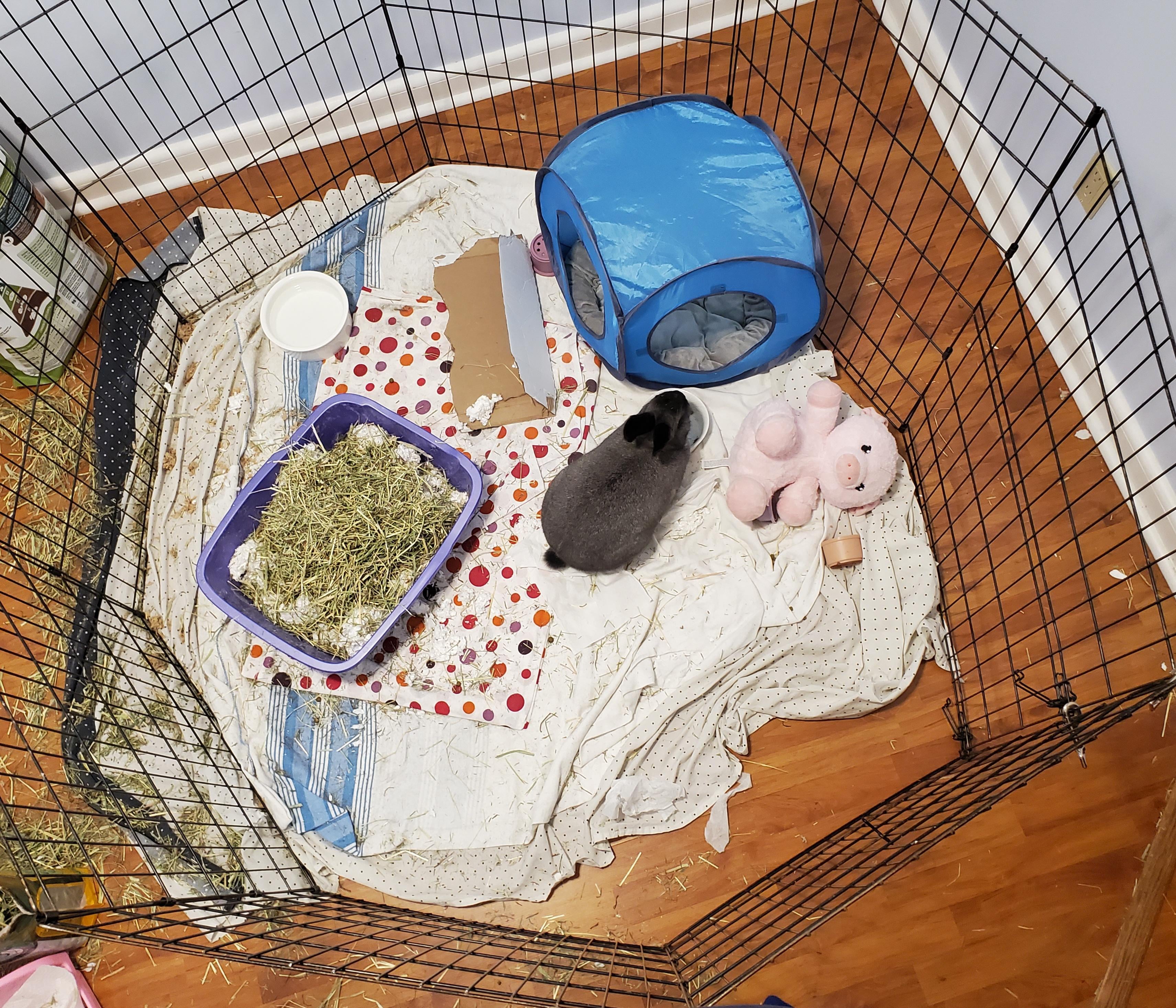 hello, I am fostering a rabbit for a local animal shelter. This is the pen and supplies they gave me when I brought her home. Its been over a month and she hasnt been adopted yet, so I was wondering if this is an appropriate long term enclosure. She gets about two hours of free roam time in the morning and evening or whenever I'm home and have free time during the day. is there anything else I can do to make her more comfortable?