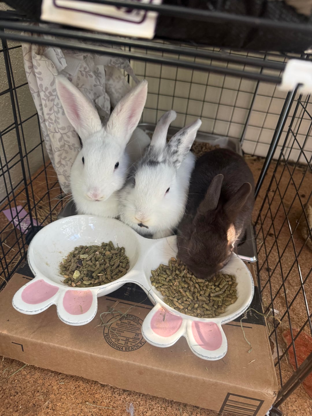 FYI – My fluffle is free roam. This setup with the food bowl at a dead-end next to the litter box is designed so that the bunnies put their butt in the litter box when eating hay and pellets. They drop the poop where they eat so I need them to eat with their bum in the box!