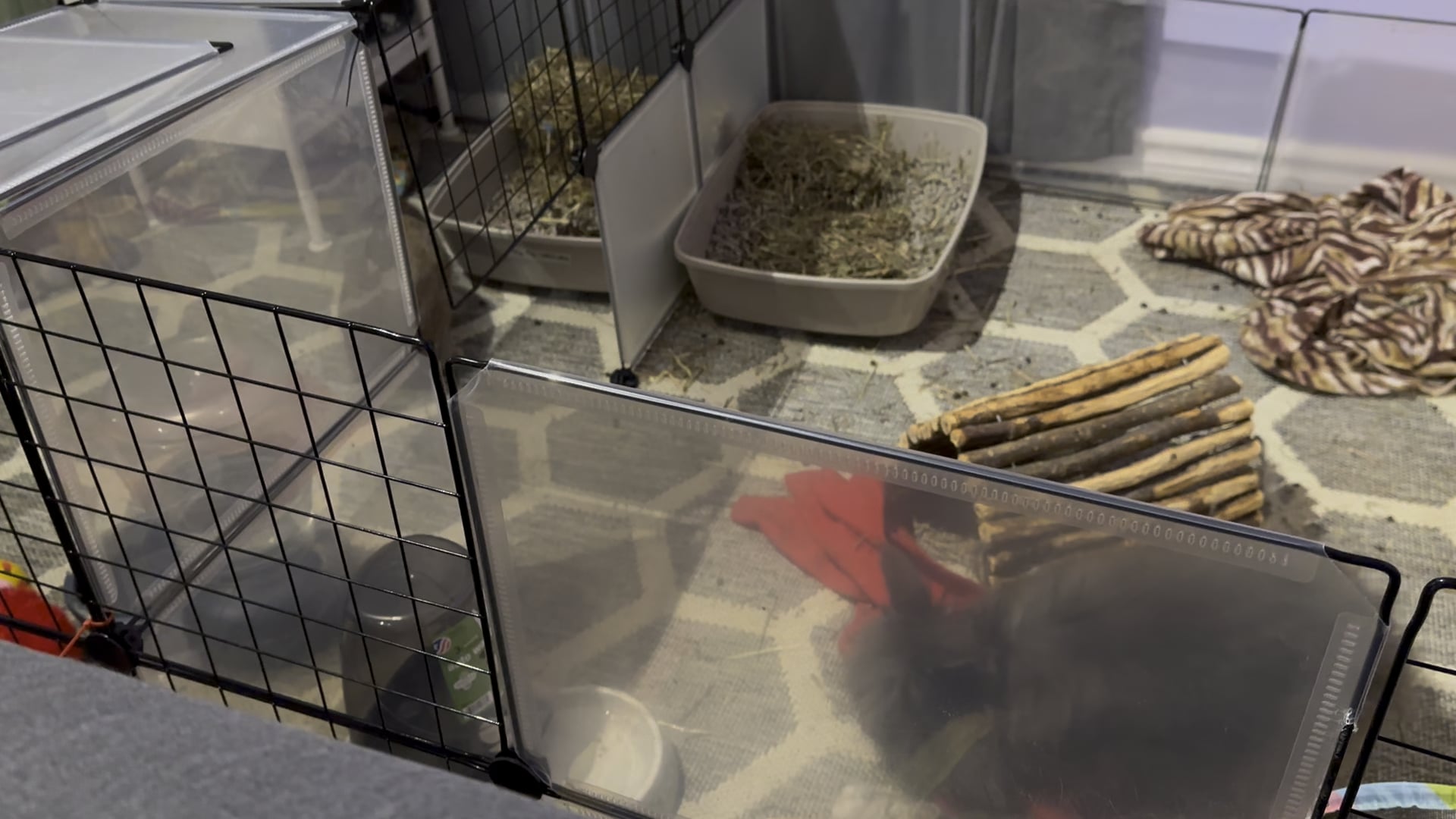 Noelle is very playful. Mochi is a grumpy old man in the body of a grumpy old bun (he’s only 5). This is the first time I have removed part of the barrier between their cages. There has been lots of switching sides and several very successful play dates in the kitchen. Earlier today they enjoyed free roaming time at the same time.