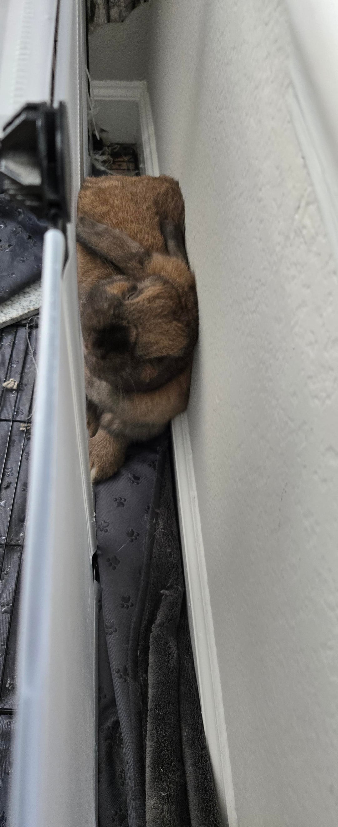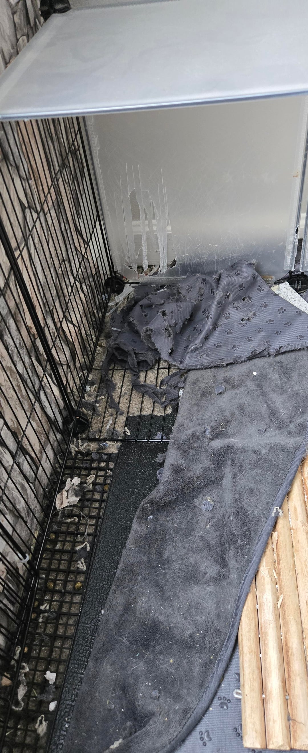 She has been on a rampage. My buns have plenty of toys, boxes, digging and foraging areas. However, Daphne chooses to tear up my couch and pillows (sorry pic not provided) and this corner of the bunny room. O' she also tore up the carpet under my desk. SHM LOL