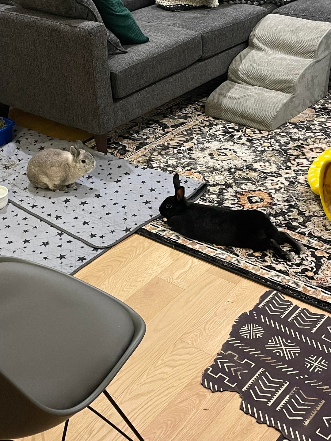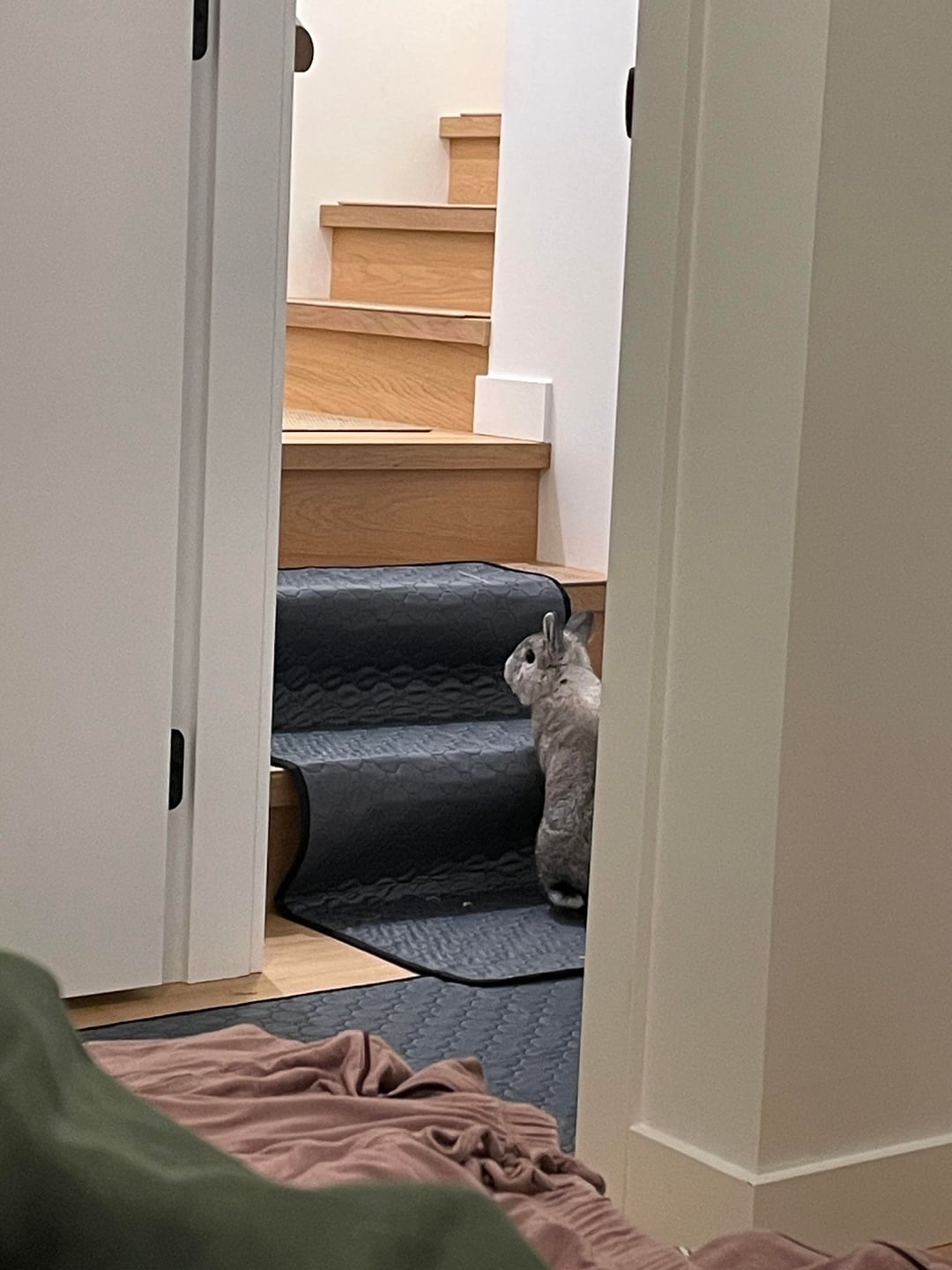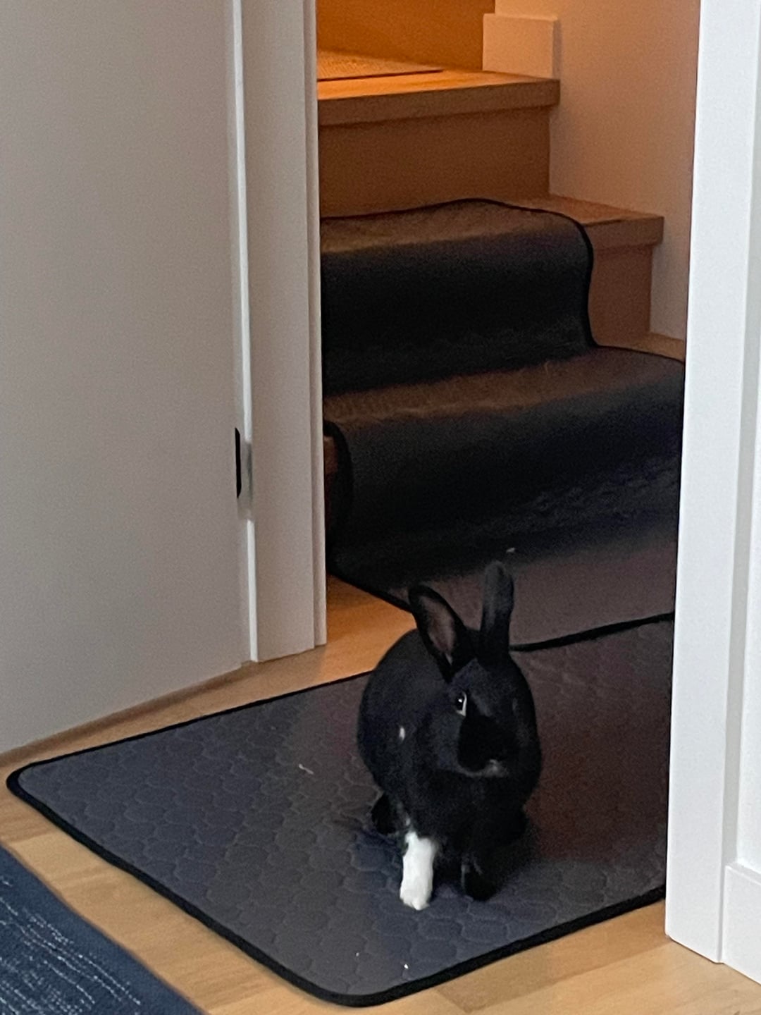 There's carpet treads on every step btw the mat is just for learning. Crow the Dutch mix and resident mountain goat quickly learned the stairs. Barnacle the little grey boy will climb anything that crow does. But the more either me or his bun wife try to coax him onto the steps the more resentful he becomes (Netherland dwarf sass). How can I show him that his two favourite places to chill are connected by these stairs and that he can use free will to go between them independently without insulting his intelligence?