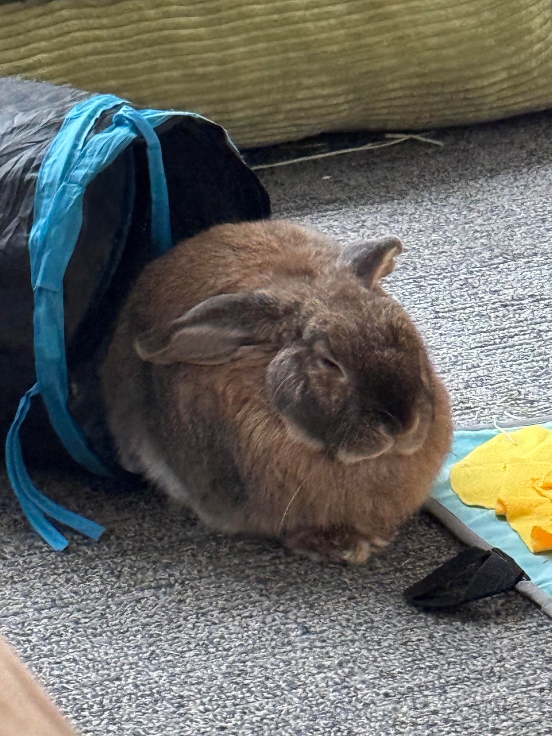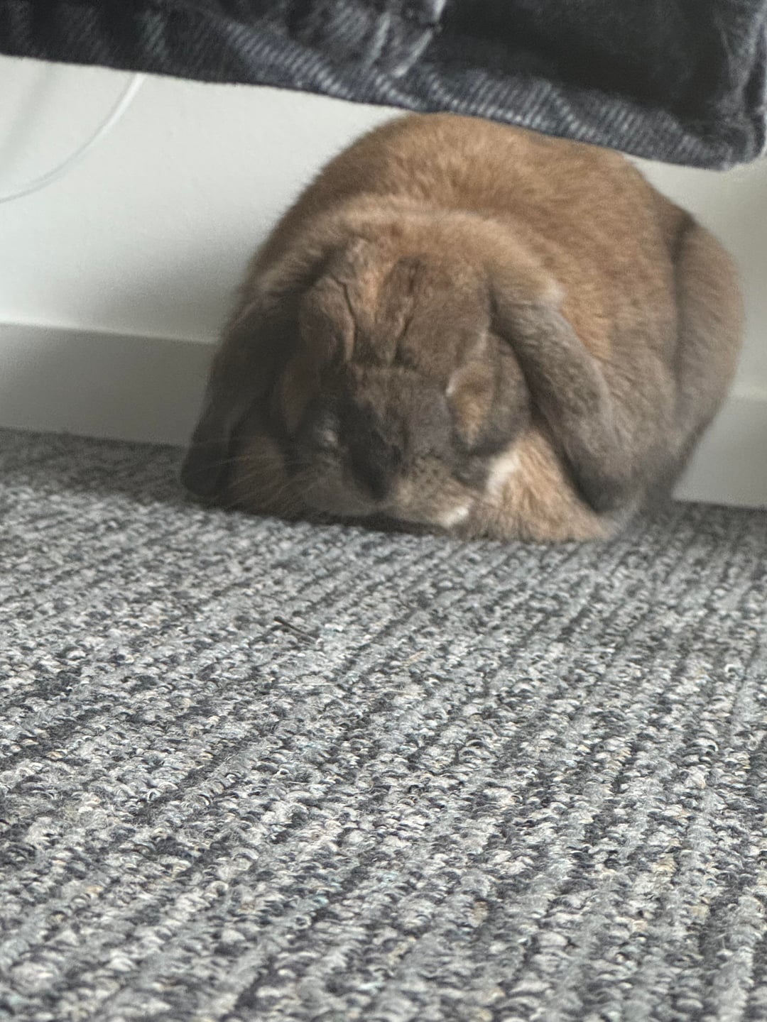 He is a solo bunny as of right now although i’m attempting to change that. That being said, he spends most of his time happily sleeping or climbing around. during these midday naps, it was common to see him lay fully on his stomach or loaf, his ears relaxed. (ex pic 1)