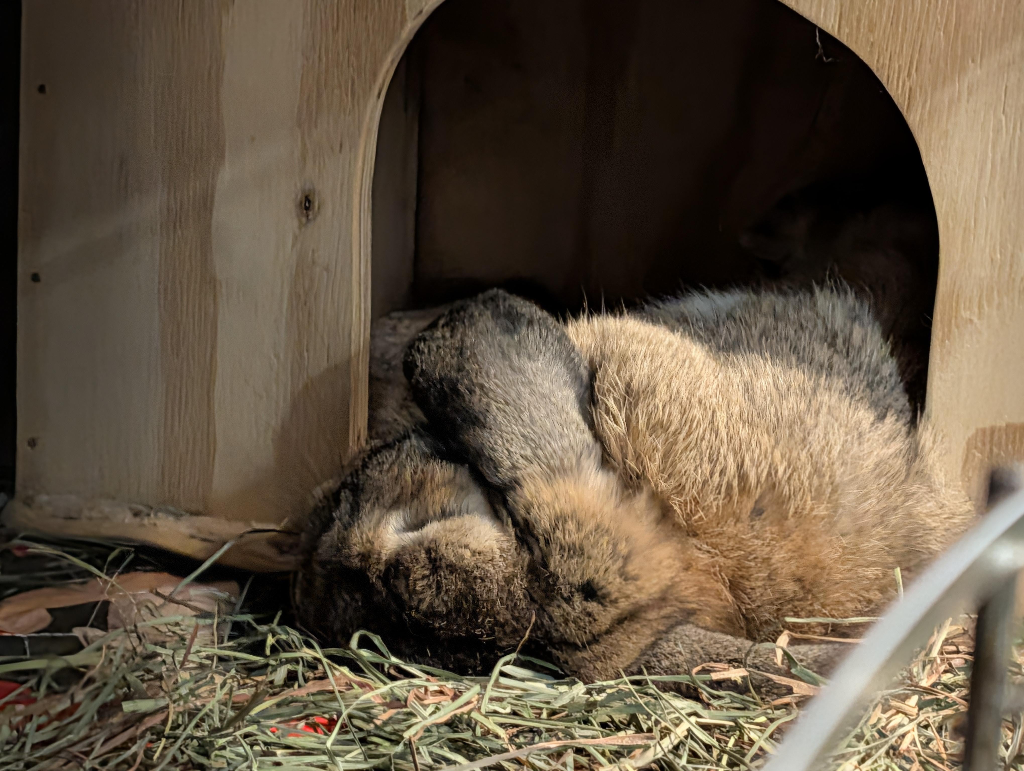I was late with Oschon's breakfast salad today and when I got to his room with his salad I wasn't greeted by him. It's uncommon, but I thought perhaps he was in his litterbox or munching hay. I looked there and my heart sank – he was laying seemingly lifeless half out of his hide.