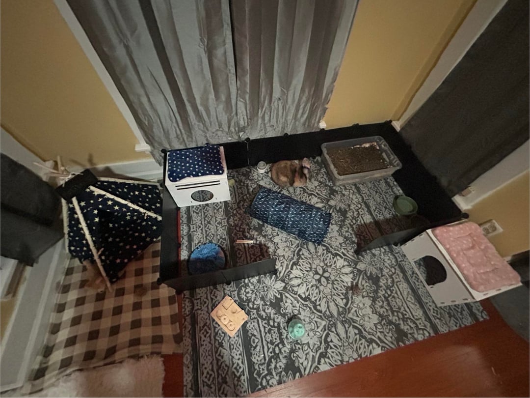 Hey guys, I just wanted some thoughts on my rabbits home base, I’ve had him almost 6 years now, he has free roam of my entire room but I made this section just for him, i am still constantly learning more for what he needs- he has more toys there just scattered around my room, I’ve also blurred out the litterbox as it needs cleaned but didn’t want anyone getting grossed out by it🤷🏼♀️ he’s the only thing that’s keeping me happy so I wanna see if there’s anything else that I could change or do that would make him happier overall. Also wanted to put into context that yes he is the only one I have, I know rabbits should be bonded with at least 1 other one. I’ve tried getting him professionally bonded 4 times and he won’t, he’s very aggressive to other bunnies even my 2 kittens. From what I can tell he-is very happy and I spend all my time with him unless I’m working