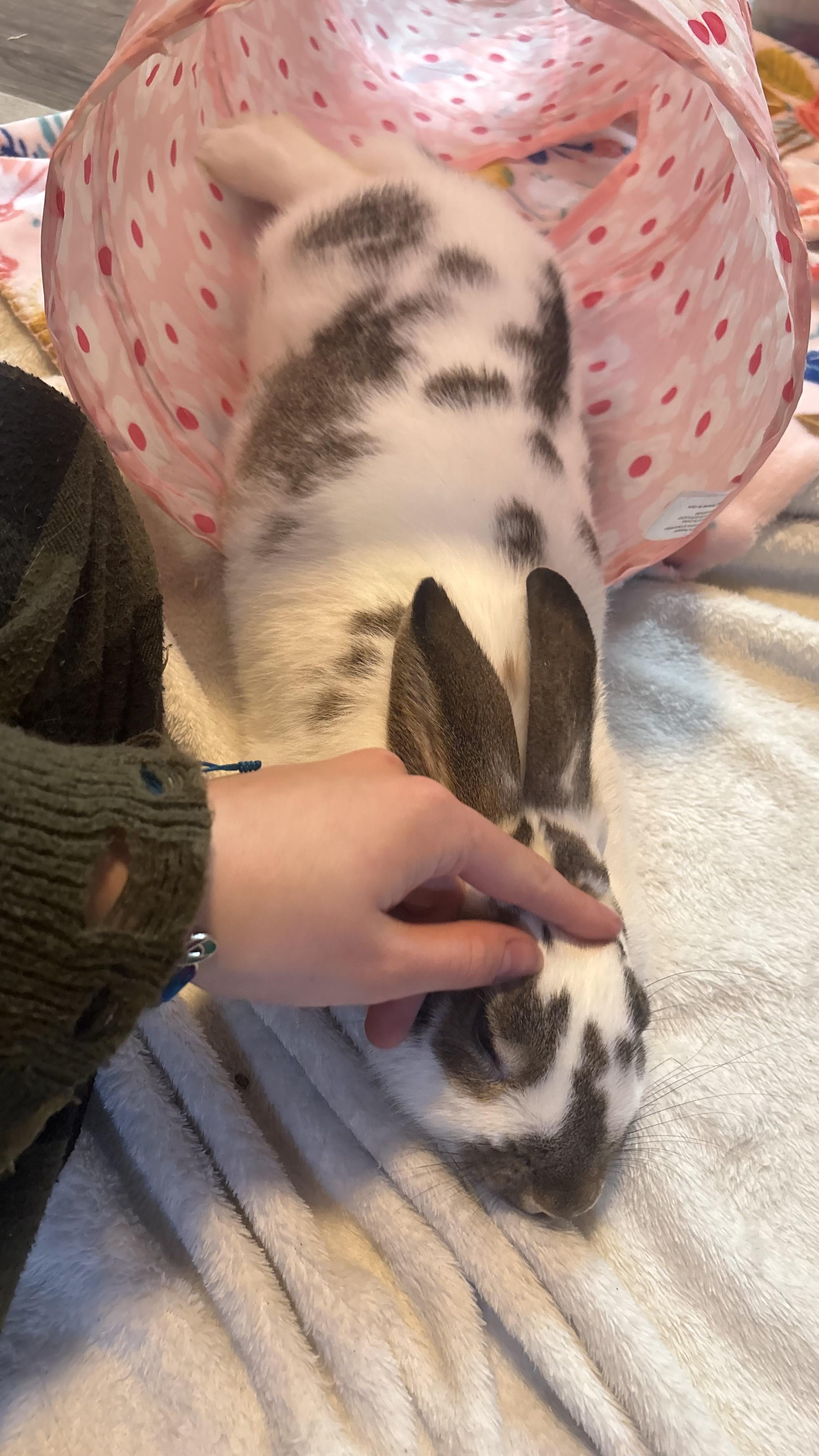 This is Honey, a very sweet girl but is really only comfortable with me.. I brought her to the vet last month and she hated it. When the vet tech went to pick her up and weigh her, she jumped into the sink, across the walls and onto the floor and ran to me and I was able to pick her up. I do think the vet tech did not pick her up the way you should pick up bunnies and that upset me a bit. She scratched up the vets arm and my hand and wrist. I was scared and felt so bad for her. For the rest of the appointment she would only let me touch her or hold her.. I had to hold her while the vet was doing a check up and I just feel so bad. The vet said I need to socialize her more.. she needs to get used to other people. She lets my boyfriend and best friend pet her and she will jump around them but my brothers or my dad she runs away fast and hides in her tunnel. I'm not sure if that is just a natural fear they have abt the vet.. or if she really is not socialized with enough people and she needs to be.. but I don't want to stress her out and do it in the wrong way. I love how comfortable she is with me, but I need her to feel safe with others too.. Does anyone know how I could help this? I want to help her get more comfortable with others being in her space and especially when she needs to be touched or picked up. I am open to any ideas or methods you guys have used or know of. Thank you!!