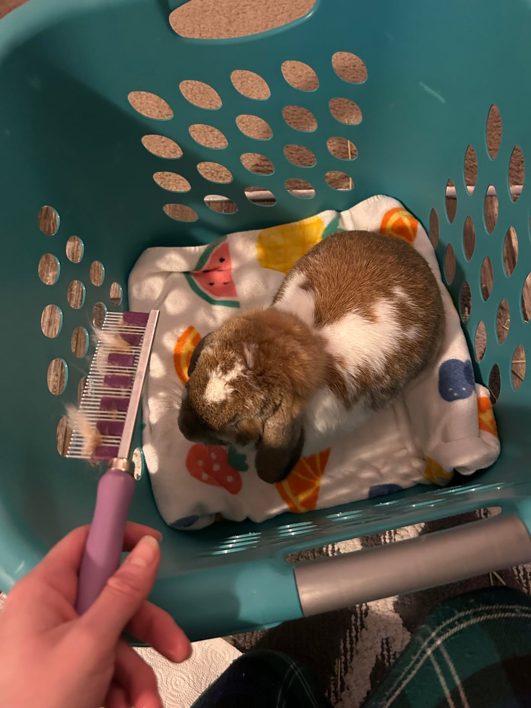 Last year, I read on this subreddit that some people put their bunny in a towel-lined laundry basket to groom them. Genius! Doing this every few days, I was able to comb way more fur off him than before. We didn’t have any episodes of stasis last year, even with a dental issue that impacted his ability to eat hay!