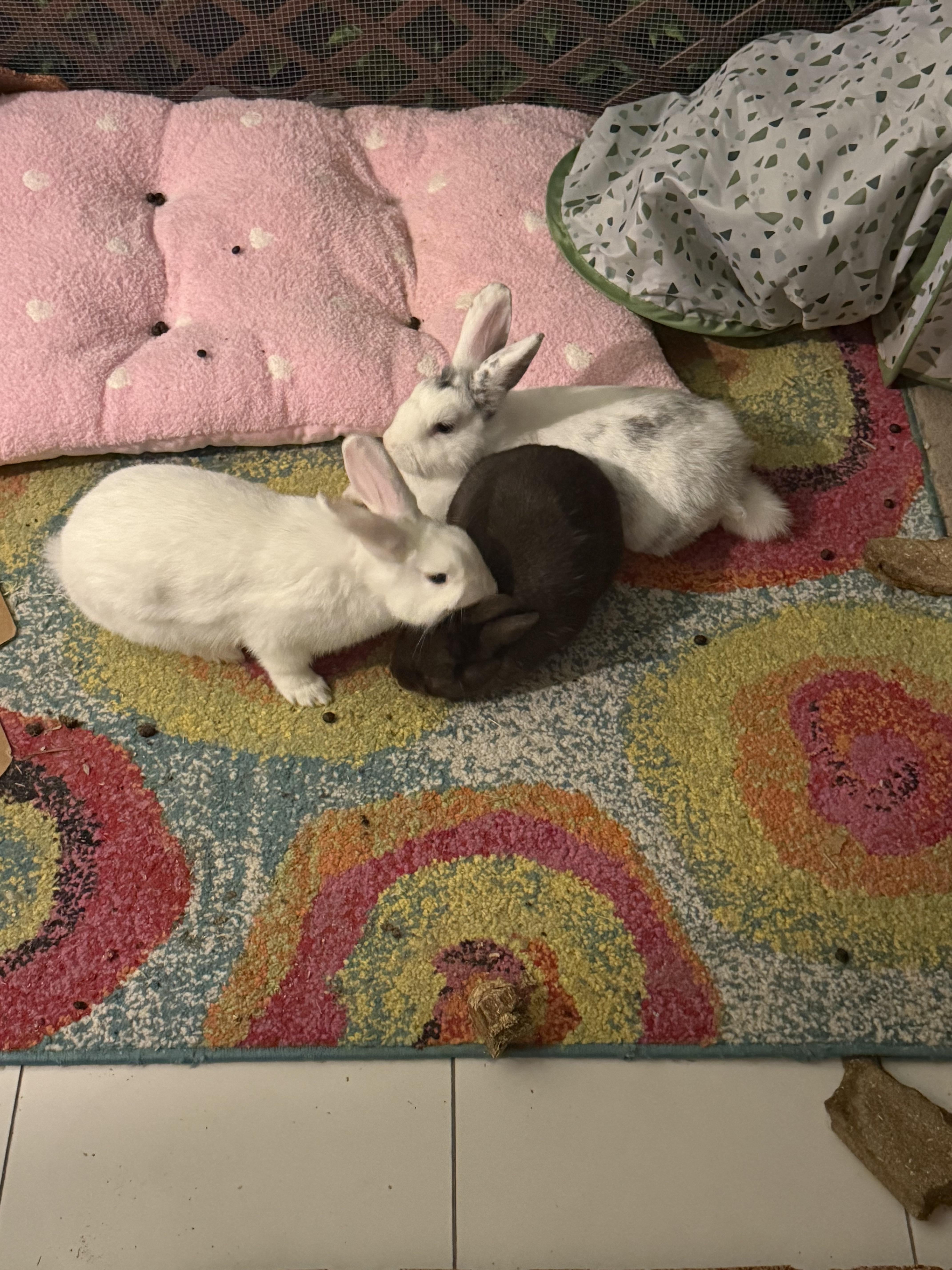 Mow one is in the closed x-pen, while the other has the rest of the porch. The boy is in the living room. Each bunny has food water and a litter-box.
