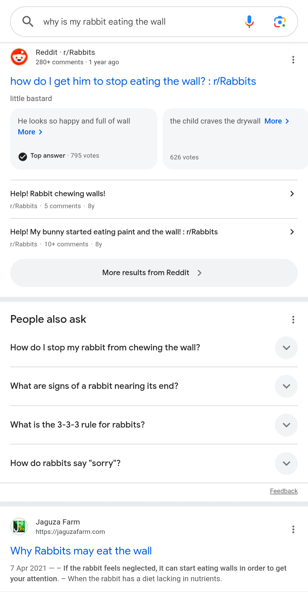 Google almost anything else and you get relatively normal results. Google anything to do with Rabbits and you get "little bastard", "he's so full of wall", "how to rabbits say sorry?"