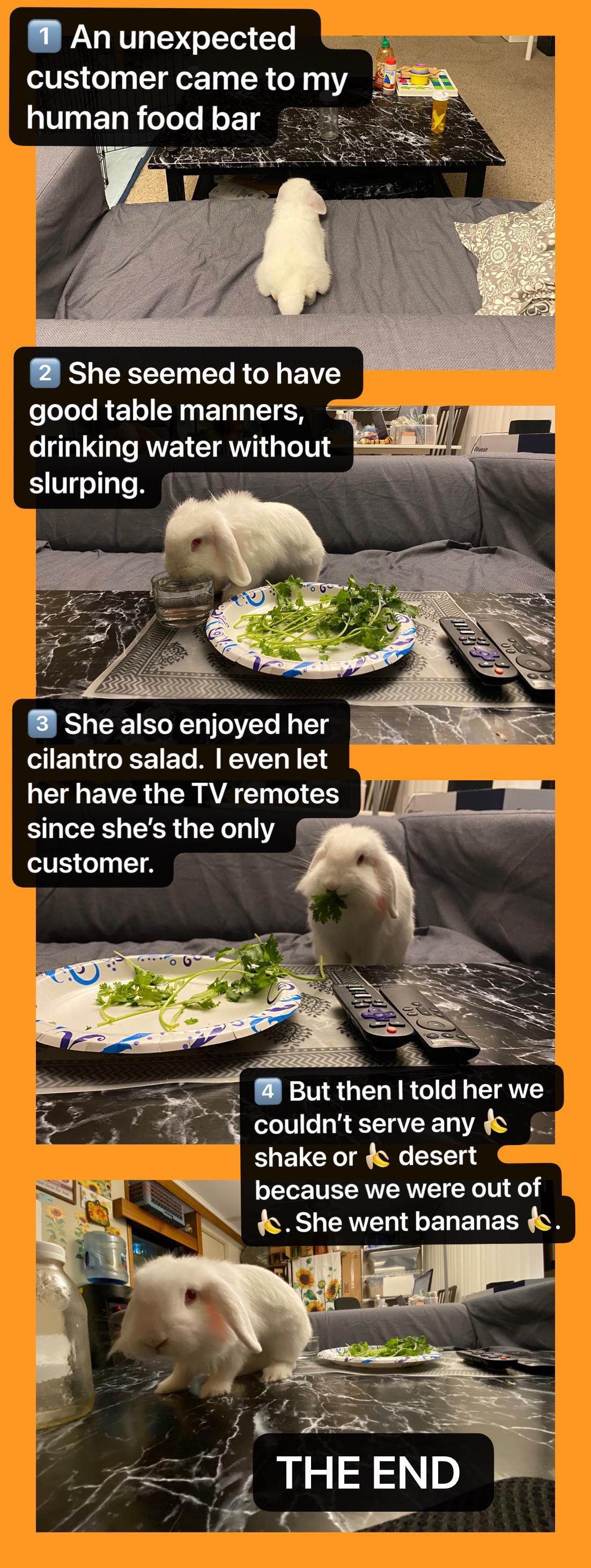 VENT: If you see this Karen bunny at your restaurant/food bar, refuse service!!! by bibo1117 bunniesbunny shaming 5 Comments Corvid-21 3 years ago What are you doing complaining on Reddit? Go buy the lady her nanners. bunnies_and_makeup 3 years ago This restaurant is racist against REWs [deleted] 3 years ago Amazed those remote control buttons came out unscathed xaznex 3 years ago She can come to mine 🥺 JDolittle 3 years ago No dessert? You monster! How could you?Write A CommentYou must be logged in to post a comment.
