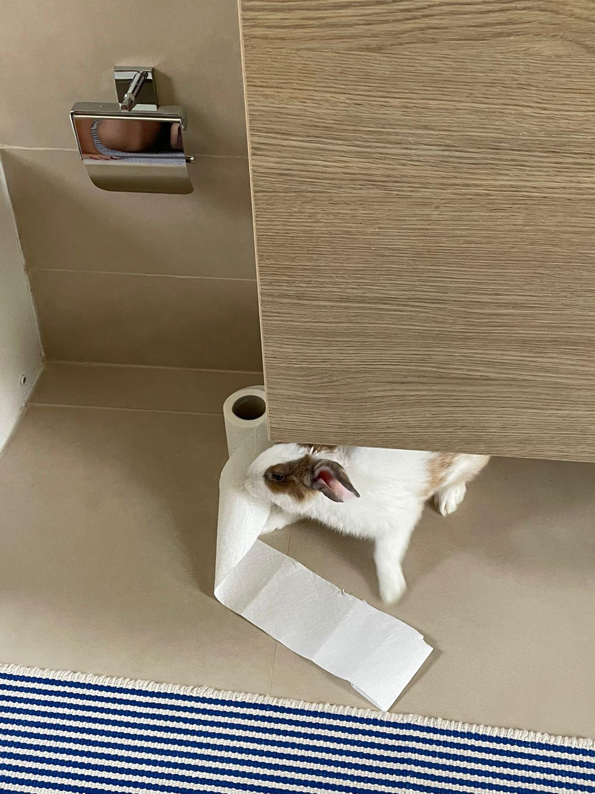 Also – is the toilet behind that wall? Isn’t that toilet paper dispenser far from the toilet? Bunny just helping out!