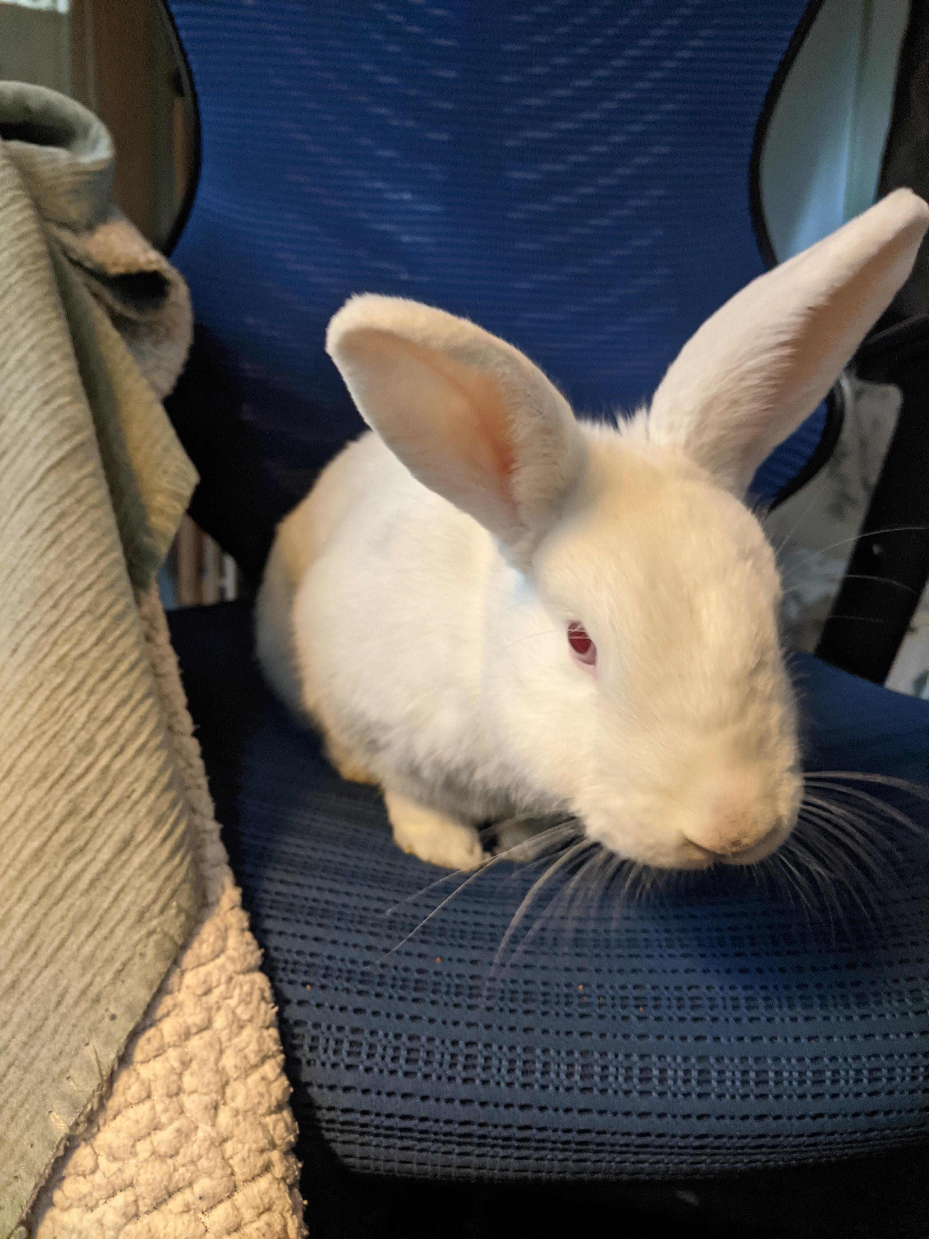 Susan decided she’s a lap bunny. When I come in, this is what I see now. She refuses to move. I have to sit on her a bit at which time she just squirms to my lap.