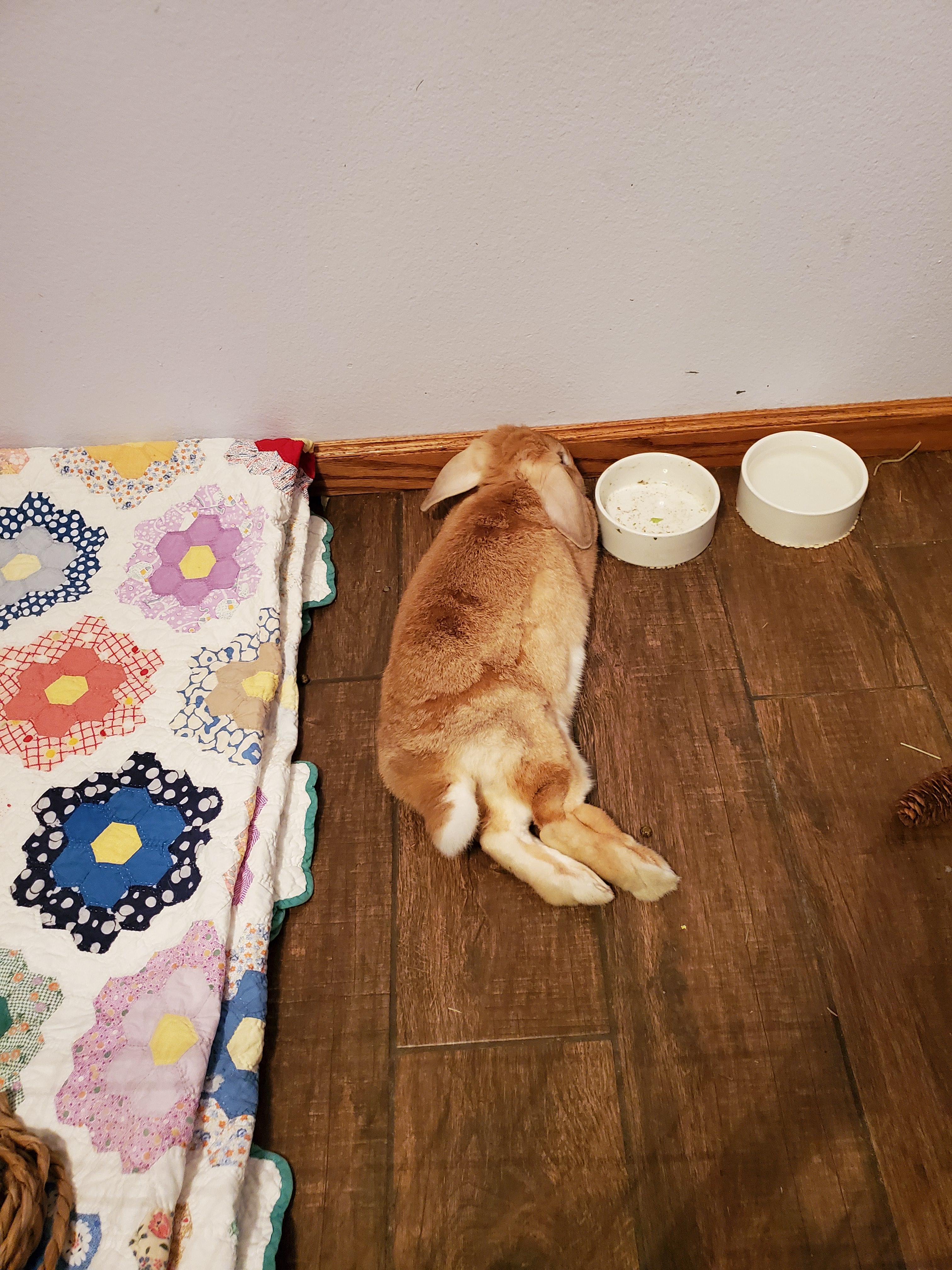 sarcasmbunny 6 years ago Mine does that too. She lays half on the wood floor and half on the carpet. I think they like the feelings. Silly hop noodles.